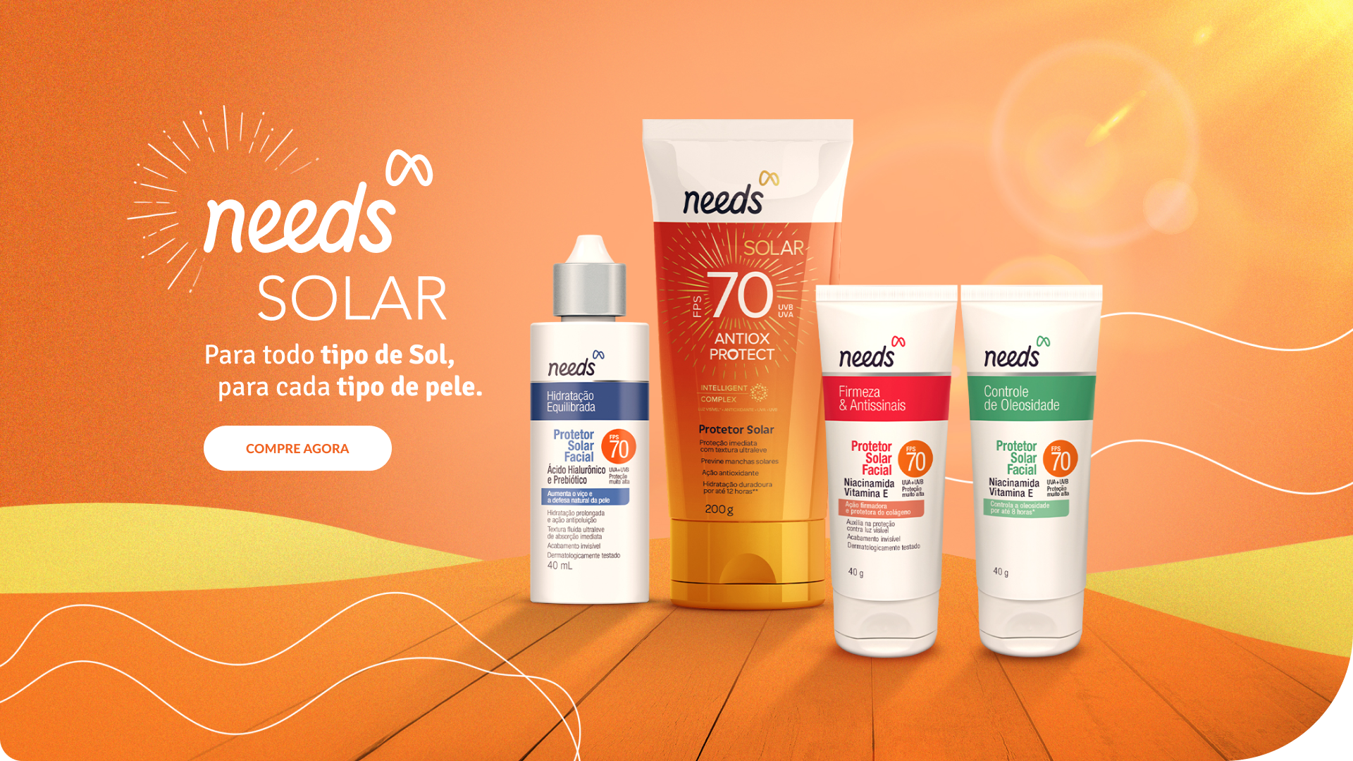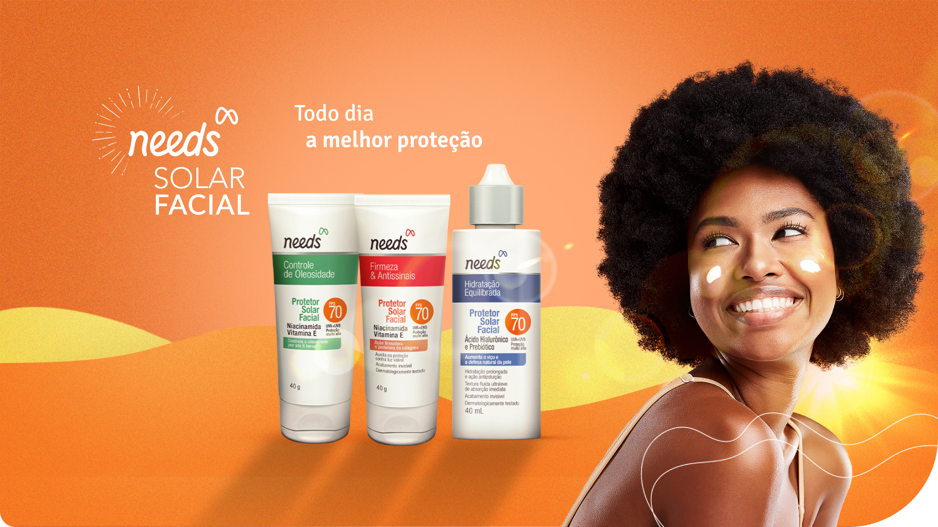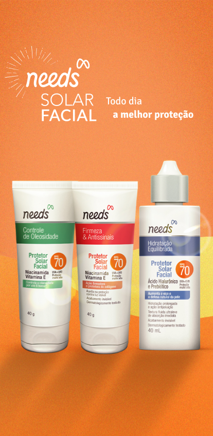 A linha Needs Solar oferece proteção completa para corpo e rosto, desenvolvida para cada tipo de sol e para todo tipo de pele.