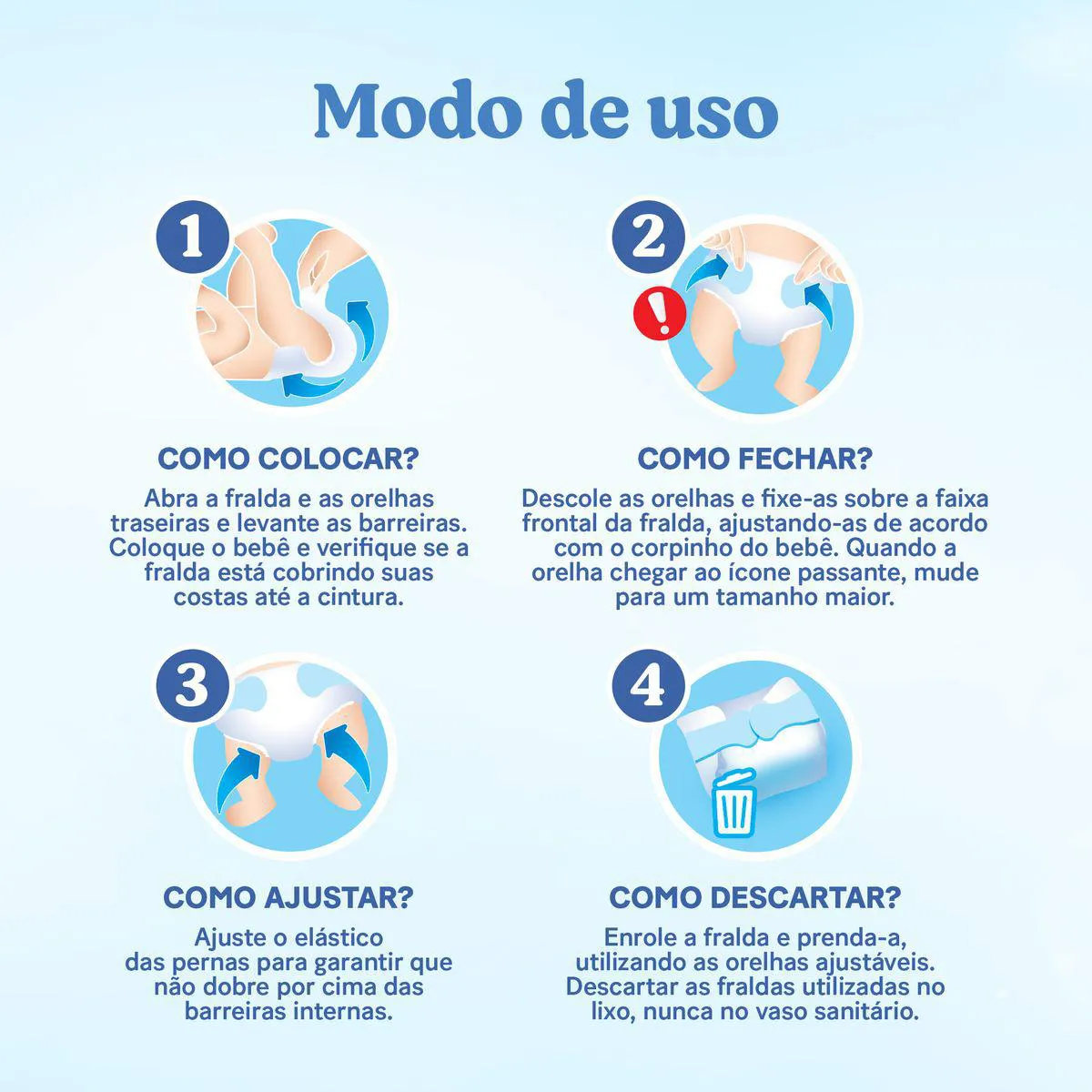 Conta com fechos mais macios e ajustáveis, que abrem e fecham quantas vezes forem necessárias, facilitando ajustar a fralda de forma confortável no corpinho do bebê.
