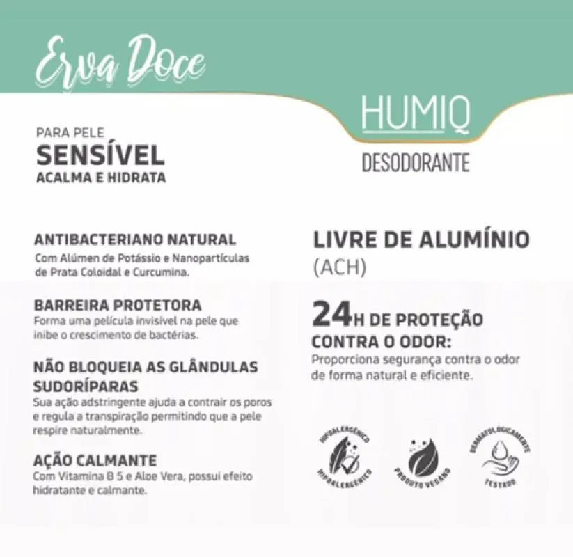 Embora não seja antitranspirante, oferece uma proteção eficaz contra odores, permitindo que sua pele respire livremente. Além disso, não causa manchas nas roupas, proporcionando tranquilidade na hora de se vestir. Com o Humiq Erva Doce, você poderá desfrutar de uma experiência única, combinando cuidado pessoal com a essência refrescante da natureza.