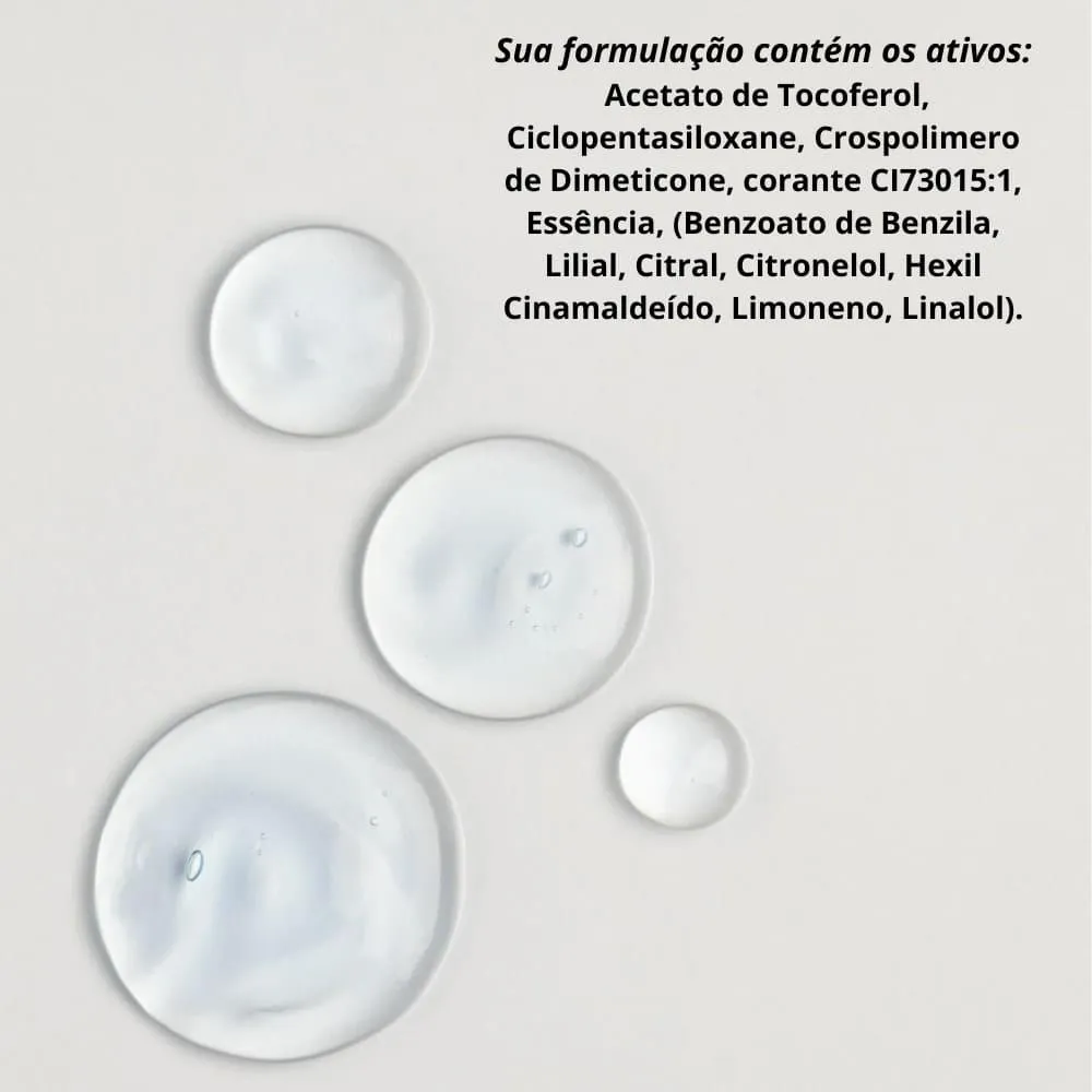 - Silicone (Ciclopentasiloxano e Dimeticone): Cria uma camada protetora que retém a hidratação e suaviza a textura da pele.