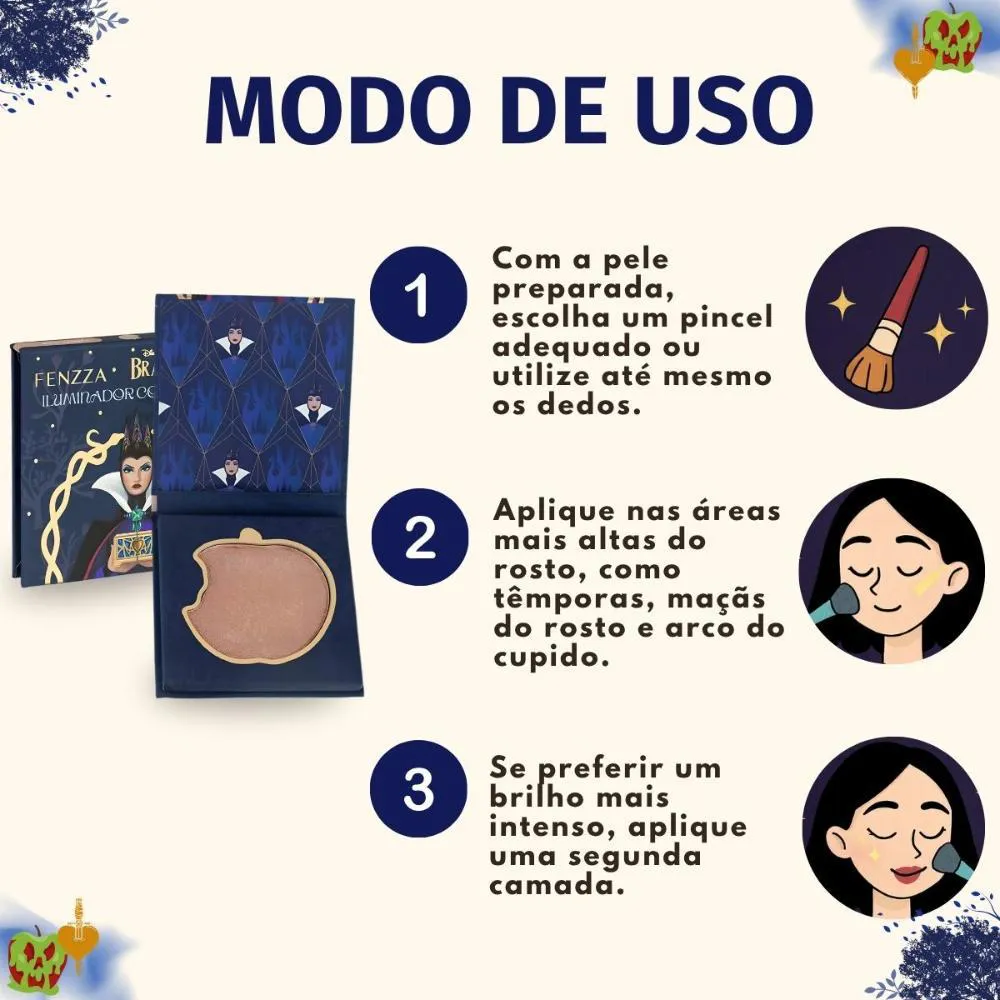 O Iluminador Compacto Fenzza Branca De Neve Disney Rainha Má Fairest Glow Dis234 é ideal para diversas ocasiões, desde o uso diário para um toque de luminosidade natural até eventos especiais, festas temáticas ou produções de maquiagem mais elaboradas. Perfeito para quem deseja um visual mágico e radiante em qualquer momento, seja para um encontro casual, uma noite de gala ou para se sentir como a realeza em seu dia a dia.Modo de Uso/Aplicação