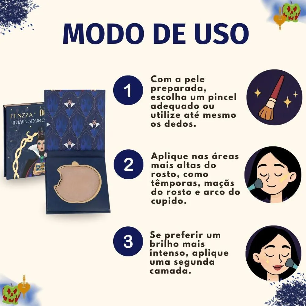 O Iluminador Compacto Fenzza Branca De Neve Disney Rainha Má Snow Sparkle Dis234 é ideal para diversas ocasiões, desde o uso diário para um toque de luminosidade natural até eventos especiais, festas temáticas ou produções de maquiagem mais elaboradas. Perfeito para quem deseja um visual mágico e radiante em qualquer momento, seja para um encontro casual, uma noite de gala ou para se sentir como a realeza em seu dia a dia.Modo de Uso/Aplicação