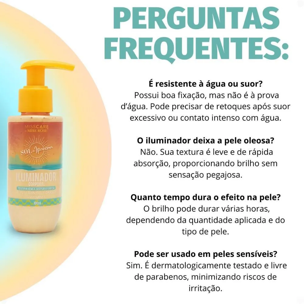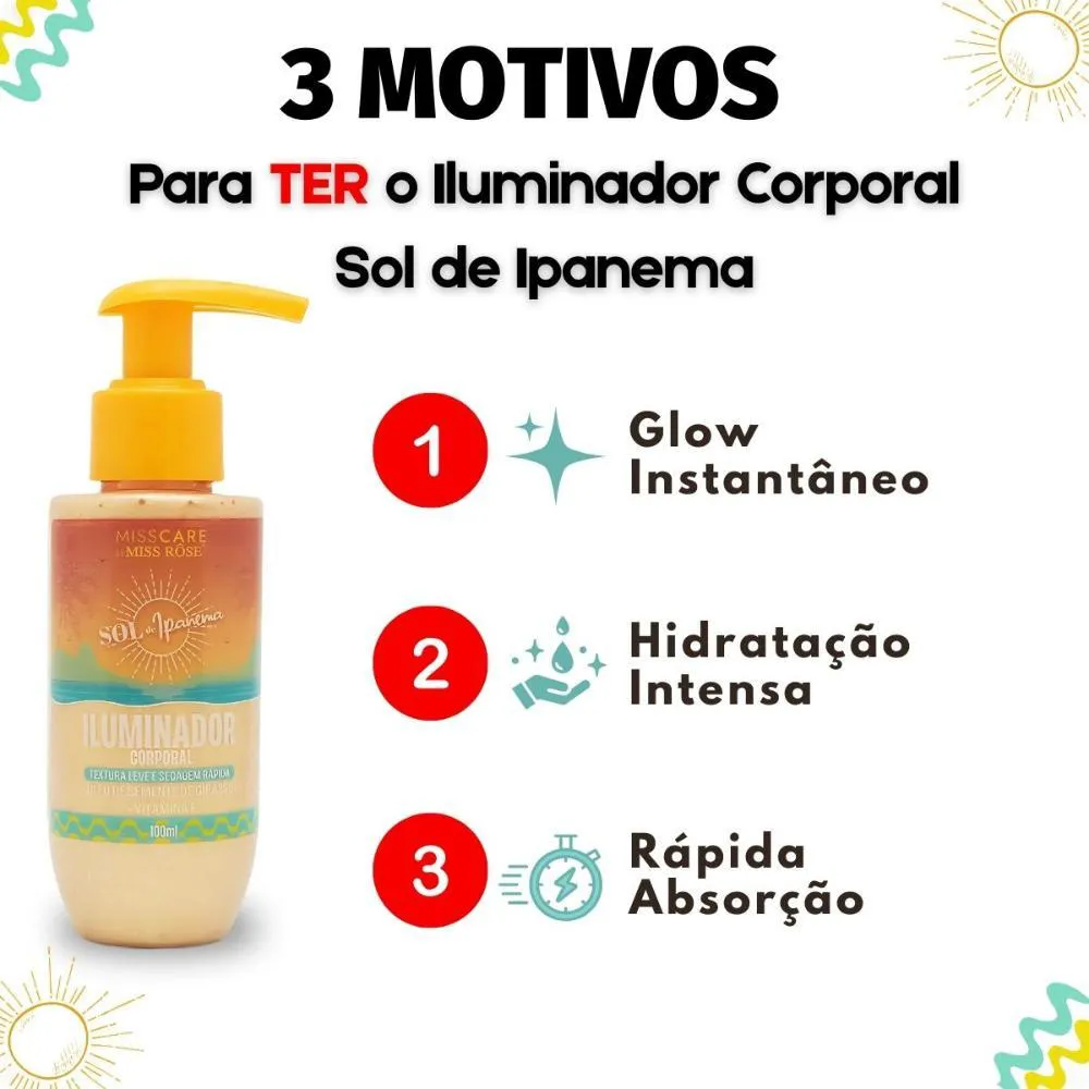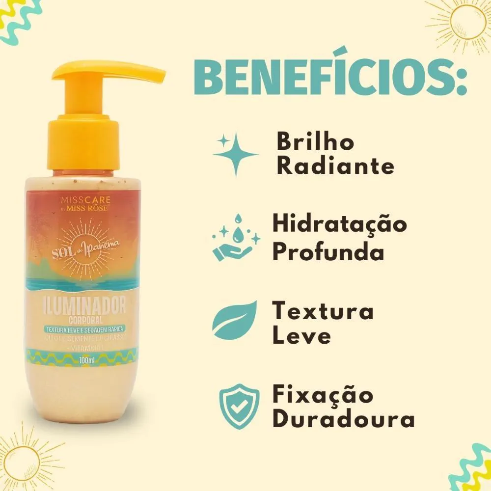 Descubra o segredo para uma pele radiante e deslumbrante com o Iluminador Corporal Miss Rôse Sol De Ipanema Dourado da Lapa 100ml. Este produto exclusivo da MISS ROSE foi desenvolvido para realçar a beleza natural da sua pele, proporcionando um acabamento brilhante e um tom dourado que evoca o esplendor do sol carioca. Ideal para quem busca um toque de glamour e sofisticação, transformando qualquer ocasião em um momento de destaque. Com este iluminador, você não apenas realça sua beleza, mas também nutre sua pele, graças à sua fórmula enriquecida. Perfeito para quem deseja brilhar intensamente e sentir-se confiante em qualquer situação.Benefícios Principais