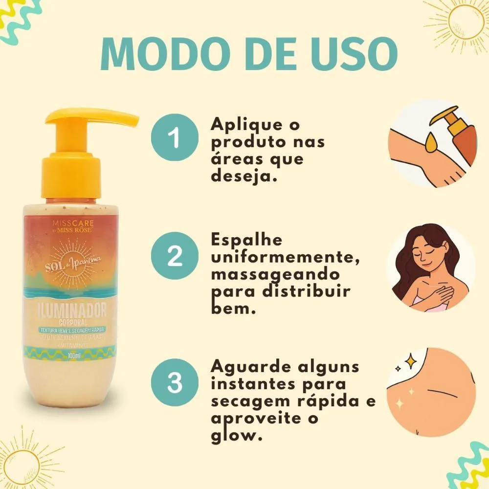 Aplique o Iluminador Corporal Miss Rôse Sol De Ipanema diretamente sobre a pele seca. Espalhe o produto em movimentos circulares suaves até alcançar uma cobertura e cor uniformes. Para um efeito mais intenso, aplique uma segunda camada após a primeira secar.Anvisa: 25351.024455/2025-28