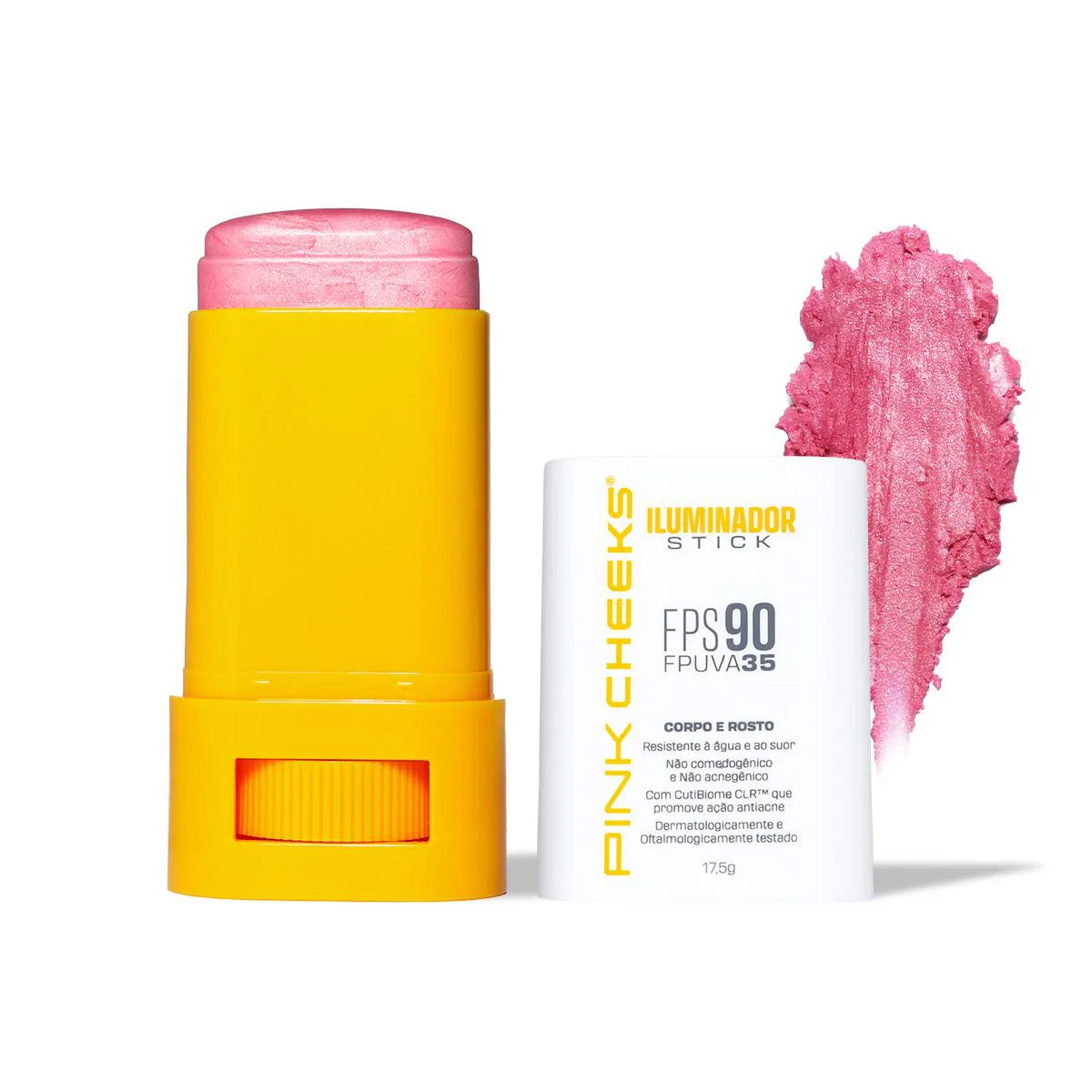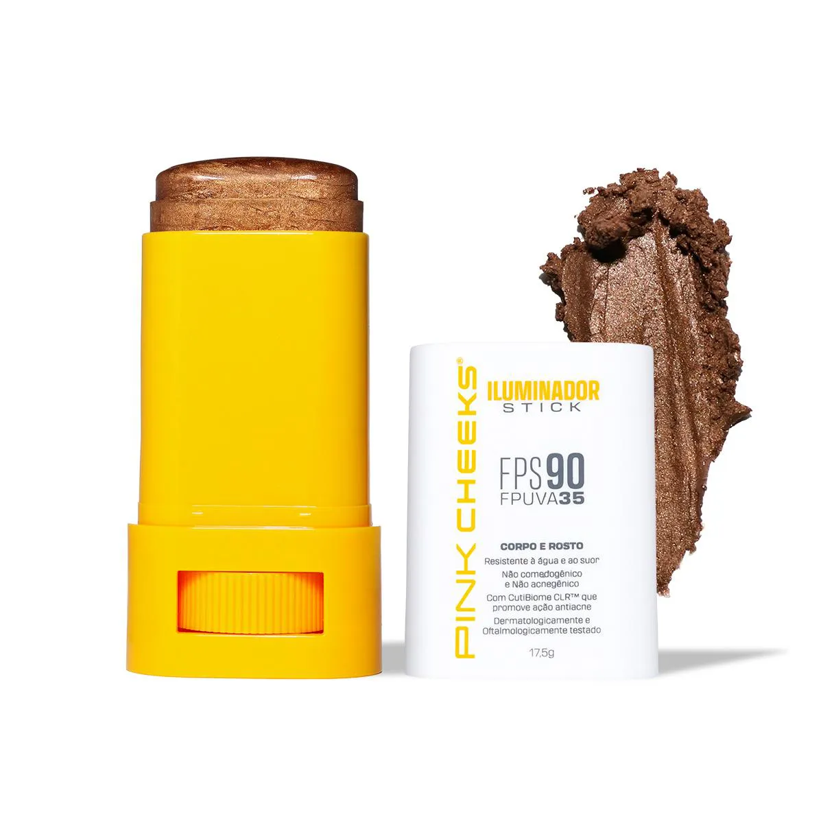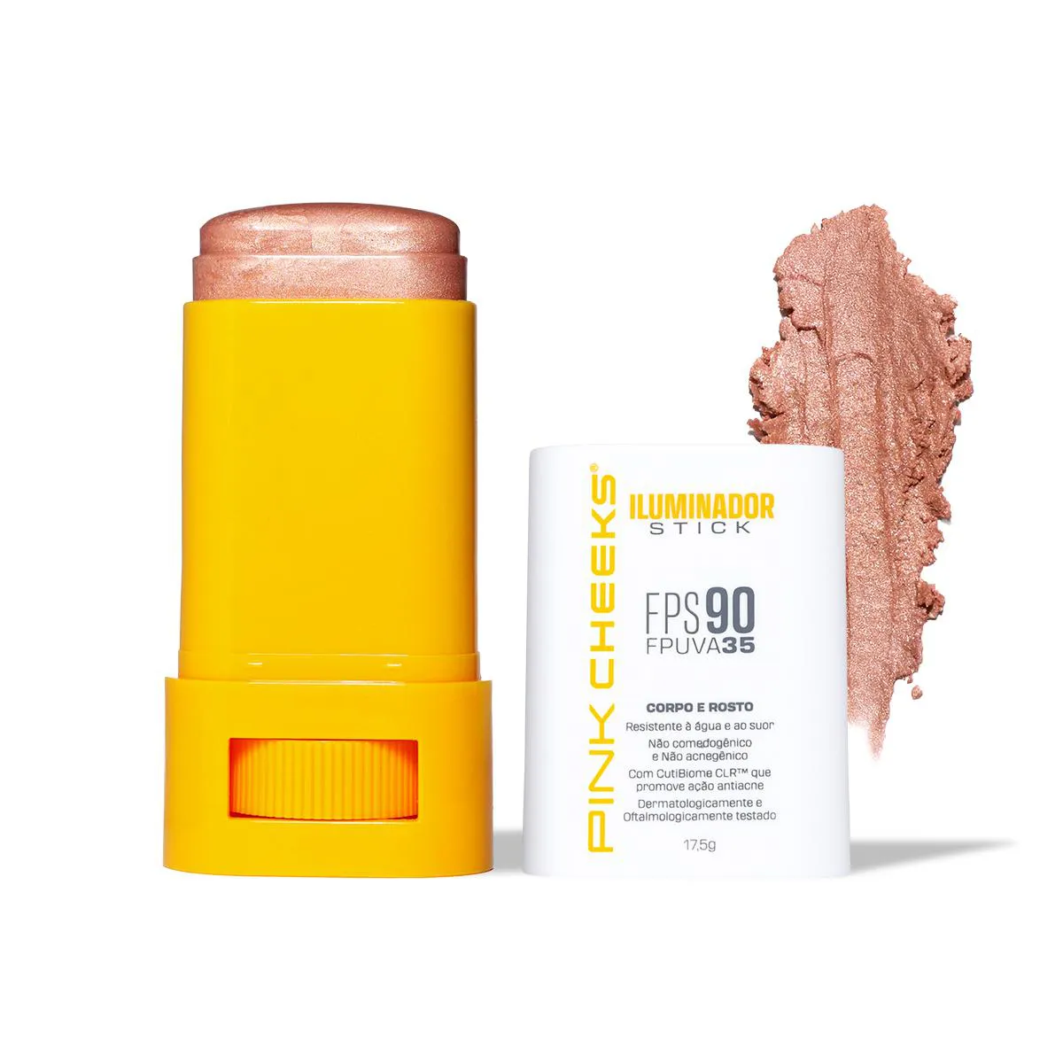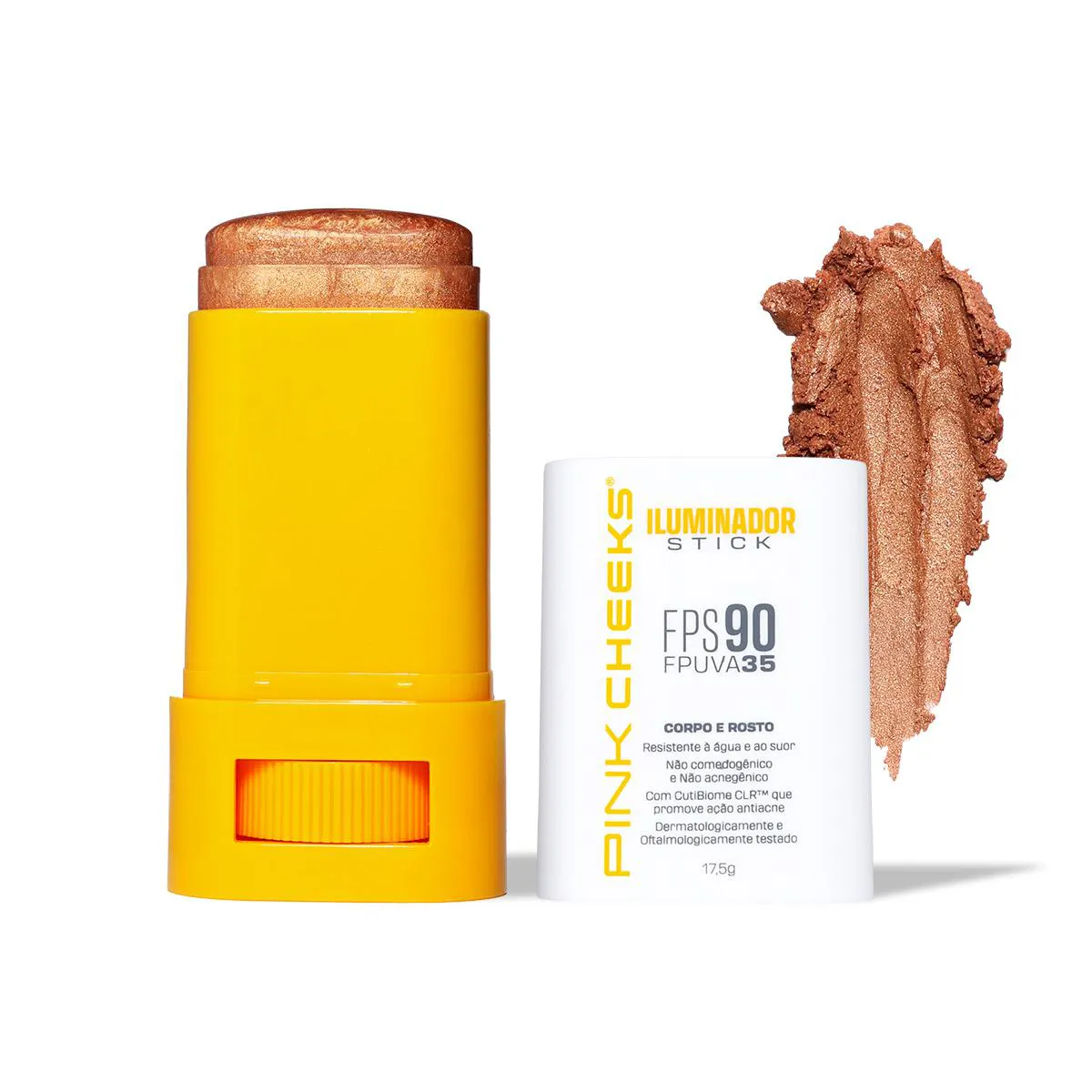 Nos seus sonhos, você imaginou um único produto com infinitas possibilidades, proteção de alta performance e brilho surpreendente, que realça a sua pele como um passe de mágica. A PINK CHEEKS atendeu esse desejo com o ILUMINADOR MULTIFUNCIONAL. Com partículas de brilho, realça suas características naturais. A cobertura é construível — ou seja, você adapta a intensidade como preferir. O toque é sequinho, sem sensação pegajosa ou oleosa. E, graças ao formato stick, a aplicação é simples. Tudo isso com proteção garantida: FPS 90 e FPUVA 35. Use onde e como quiser: para iluminar pontos específicos ou espalhar por todo o corpo. Como se pudéssemos superar suas expectativas — e podemos! — essa fórmula merece destaque. Nosso iluminador tudo-em-um é potencializado com CutiBiome CLR™, um ativo que reduz a inflamação da acne e controla a oleosidade. E para brilhar sem preocupações: também é resistente à água e ao suor. Fique à vontade para escolher o brilho que mais te chamar a atenção. Mas para facilitar a escolha, essas são as nossas indicações: se tons quentes realçam seus traços, você vai amar o Gold. Agora, se a cartela fria te favorece mais, experimente o Rosé ou o Champagne. Ainda, se sua pele é retinta, o Bronze foi desenvolvido pensando especialmente em você! Benefícios e Resultados