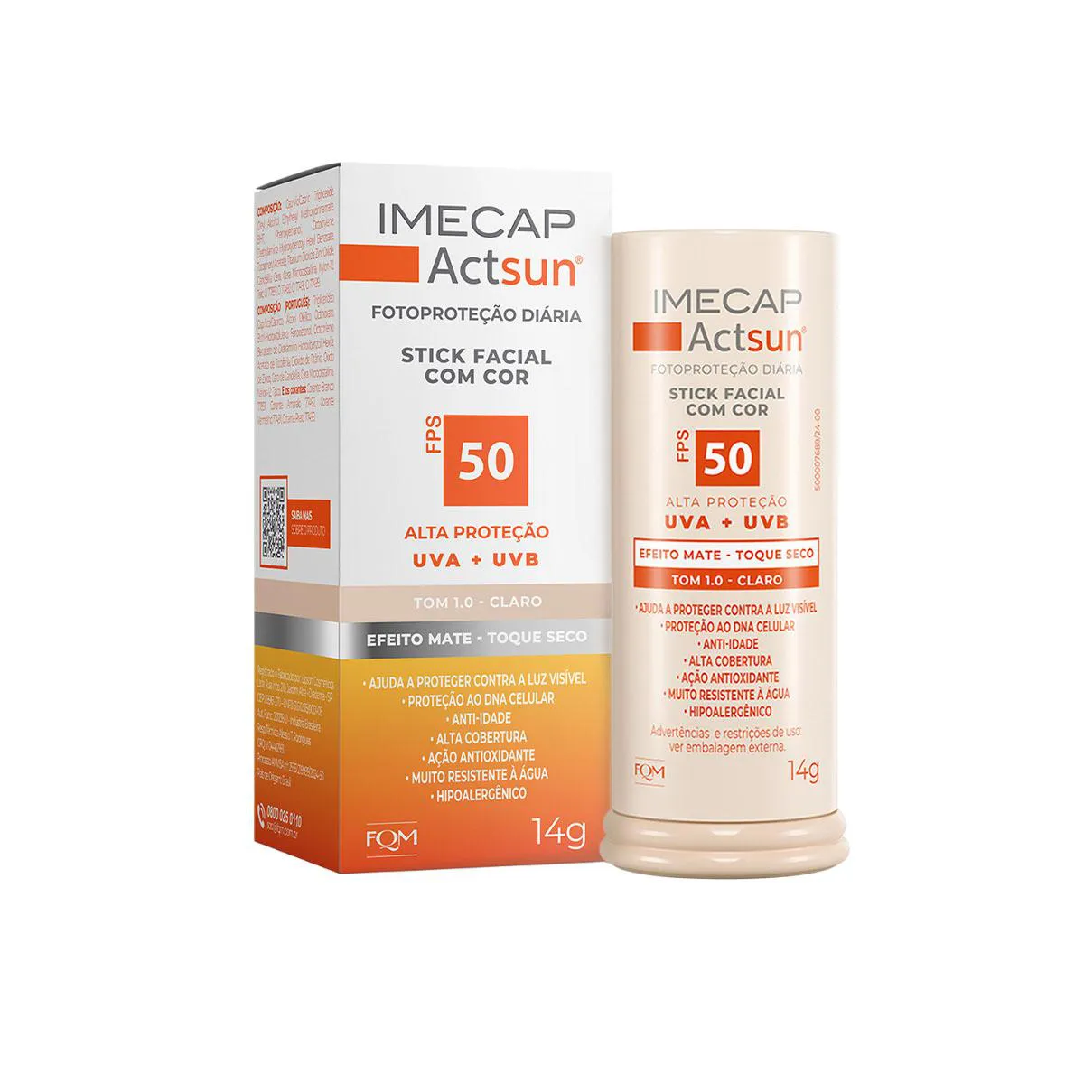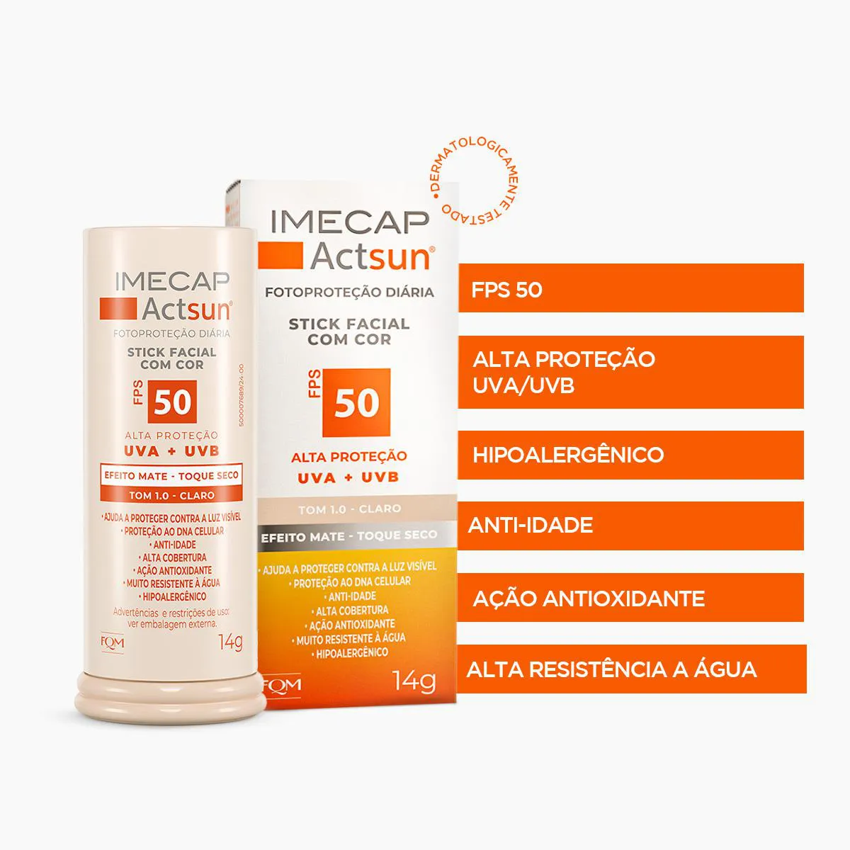 O Protetor Solar Facial Stick Imecap Actsun FPS 50 Claro é um filtro solar de uso diário desenvolvido especialmente para o rosto. Com altíssima proteção UVA, UVB e UVA longo, sua fórmula inovadora protege a pele contra os efeitos imediatos e cumulativos do sol, além de defender contra radicais livres, luz visível, infravermelho e os danos causados pelo fotoenvelhecimento. Possui ação antioxidante, anti-idade e ajuda a prevenir manchas como melasmas, mantendo a pele saudável, protegida e com tom uniforme.