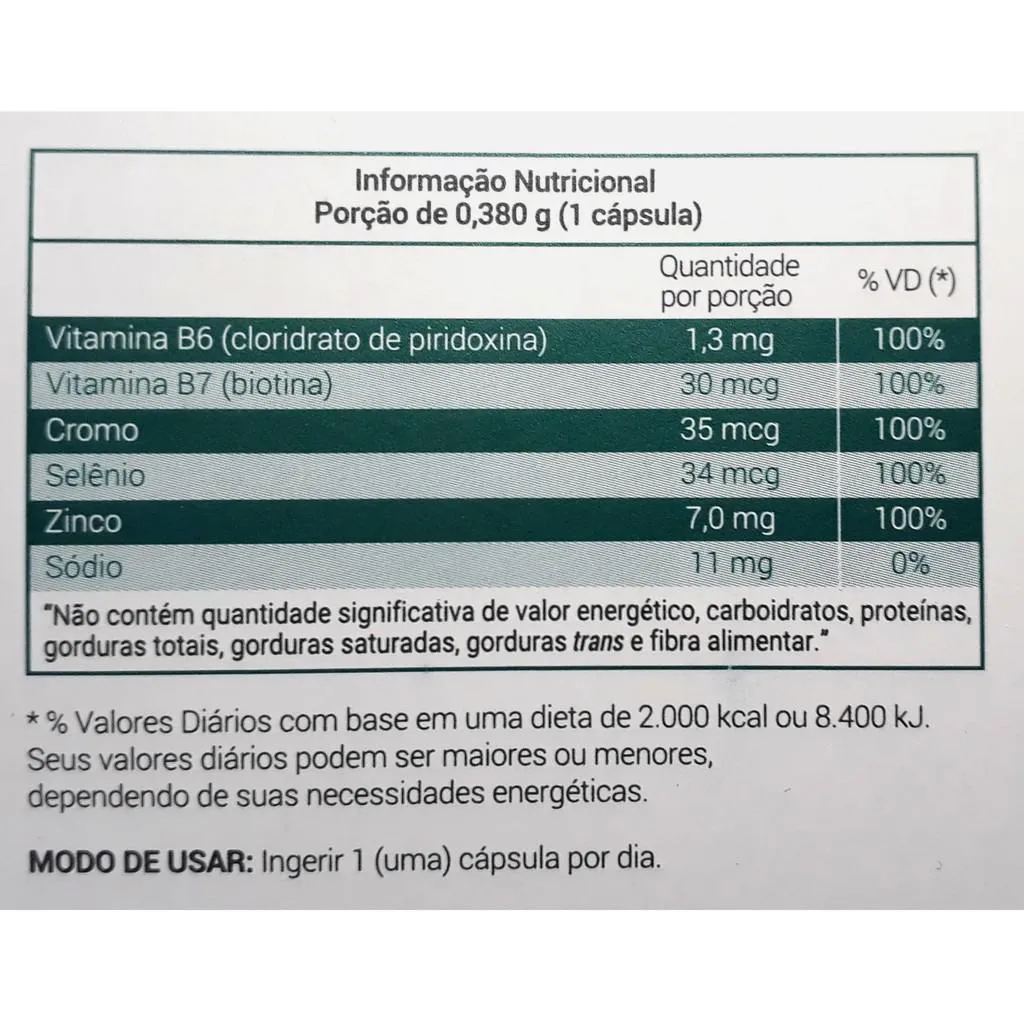Além da Biotina (vit. B7), Piridoxina (vit. B6), Selênio, Cromo e Zinco, contém colágeno hidrolisado e a presença de dois aminoácidos responsáveis pela formação da queratina do cabelo, que são a L-cistina e a Cisteína.