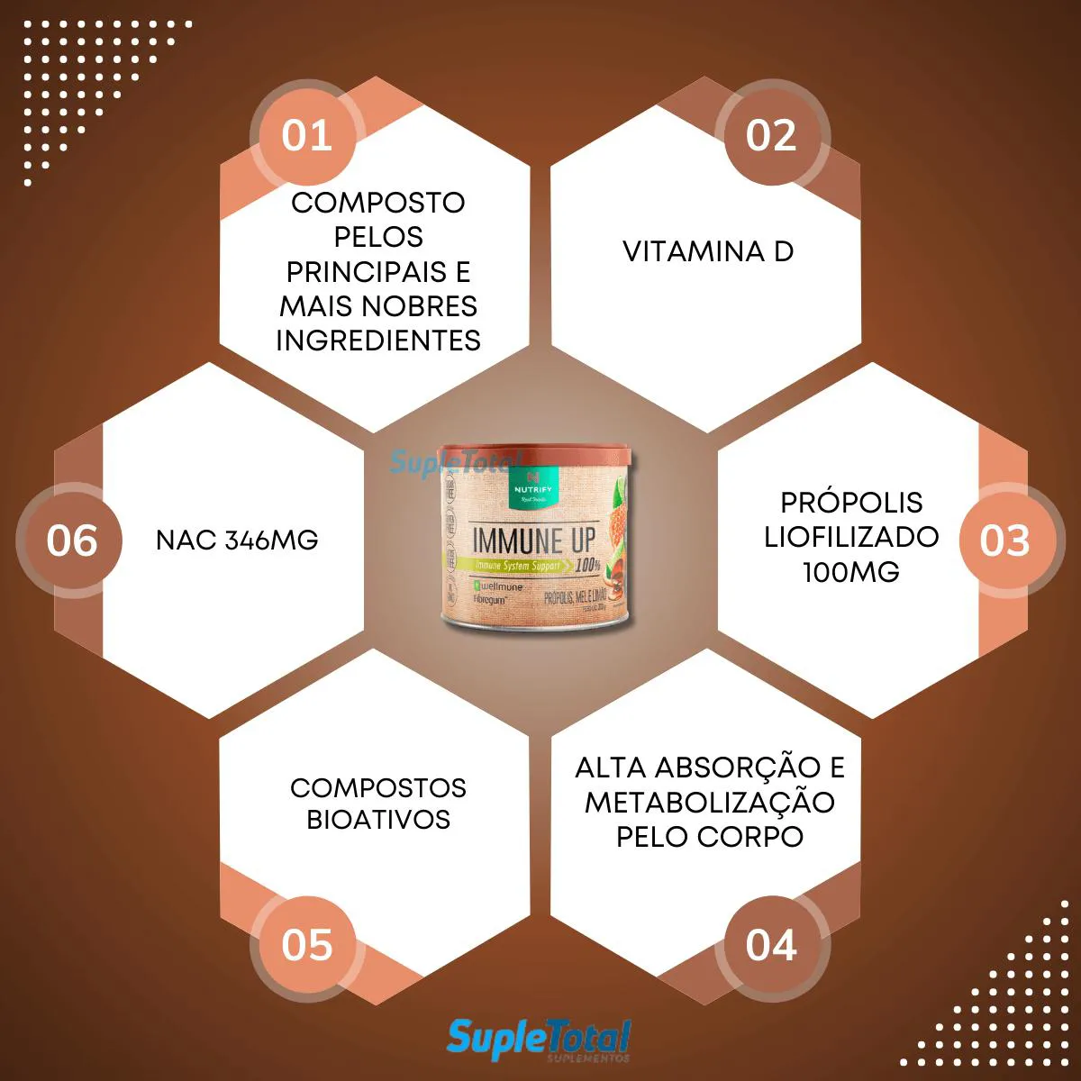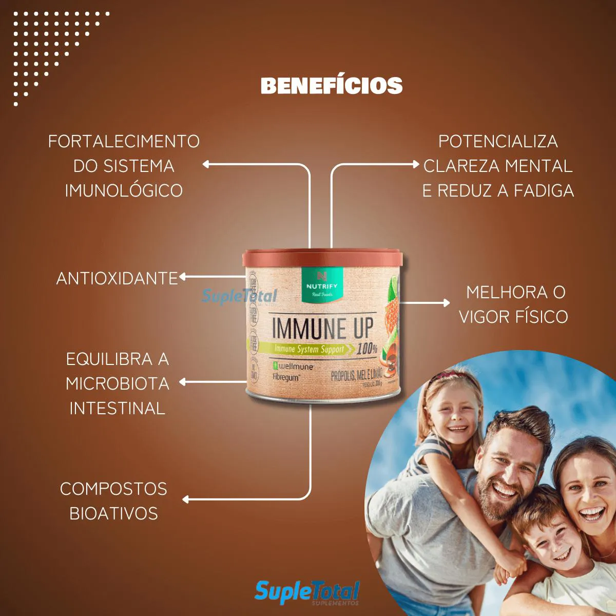 O Immune Up Nutrify é um suplemento nutricional composto por uma formulação especial de compostos bioativos, incluindo Wellmune® (beta-glucana de levedura), FibregumTM (fibra prebiótica), própolis verde, gengibre e um mix de vitaminas e minerais antioxidantes. Serve para fortalecer o sistema imunológico, reduzir inflamações, equilibrar a microbiota intestinal, proteger contra radicais livres e oferecer suporte nutricional geral, com propriedades anti-inflamatórias, antioxidantes, antivirais e antibacterianas.