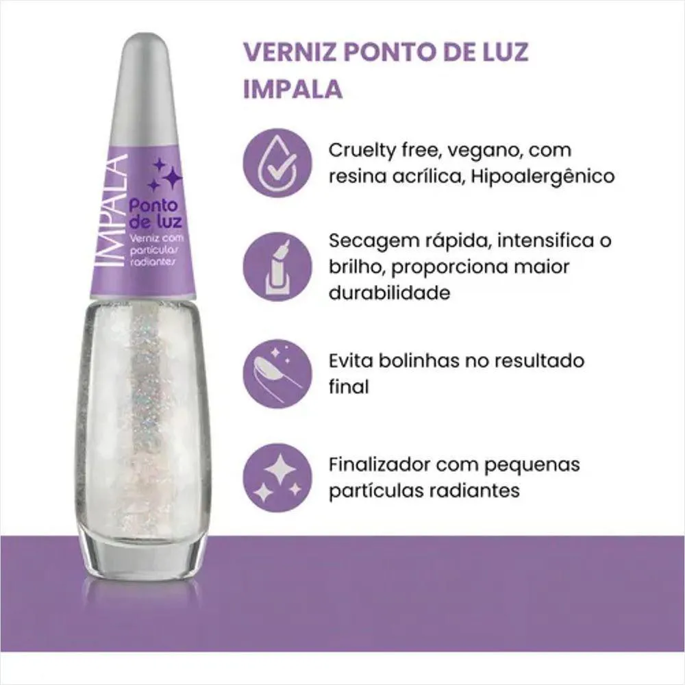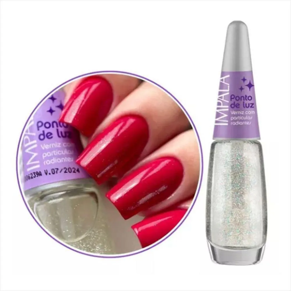 Impala Verniz C/ Partículas Radiantes Pontos De Luz 7,5ml: Brilho e Glamour em Cada Aplicação!Seja bem-vinda ao universo da elegância e do estilo com o Impala Verniz C/ Partículas Radiantes Pontos De Luz! Este esmalte incrível combina uma de alta qualidade com partículas luminosas que transformam suas unhas em verdadeiras obras de arte. Com apenas 7,5ml, ele é a escolha perfeita para quem busca um toque de glamour para qualquer ocasião.Introdução:O Impala Verniz C/ Partículas Radiantes é mais do que um esmalte; é a sua nova arma secreta para um visual sofisticado. Sua textura cremosa proporciona uma aplicação suave e uniforme, enquanto as partículas radiantes proporcionam um efeito de luz que realça a beleza das suas unhas. Perfeito para qualquer estilo, este verniz é a definição de versatilidade e charme.Ingredientes e Composição:A do Impala Verniz é enriquecida com ingredientes de alta qualidade que garantem durabilidade e resistência. Entre seus componentes principais, destacam-se:Resinas especiais: Proporcionam uma brilhante e de longa duração.Partículas luminosas: Criam um efeito deslumbrante e exprimem sua personalidade única.Pigmentos vibrantes: Garantem cores intensas e vibrantes, que não desbotam facilmente.Modo de Usar:Para obter o melhor resultado, siga estas etapas simples:Prepare suas unhas, limpando-as e aplicando uma base para proteção.Aplique uma camada uniforme do Impala Verniz e deixe secar.Para um efeito ainda mais surpreendente, aplique uma segunda camada.Finalize com um top coat para aumentar o brilho e a durabilidade.Benefícios:Com o Impala Verniz C/ Partículas Radiantes, você desfrutará de um brilho intenso que destaca suas unhas por dias a fio! Sua de secagem rápida evita o uso excessivo de tempo e espera, tornando a experiência de manicure simples e prática. Além disso, é fácil de remover, sem deixar resíduos indesejados.