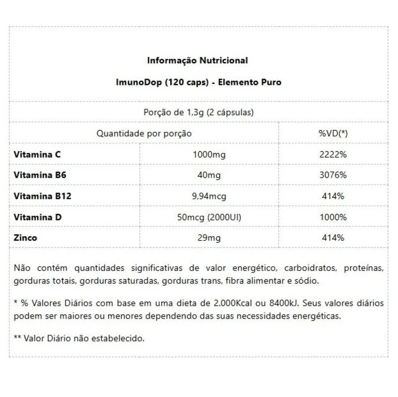 ImunoDop (120 caps) - Elemento Puro As vitaminas C, D, B6, B12 e o zinco auxiliam no funcionamento do sistema imune. A vitamina c e o zinco são antioxidantes que auxiliam na proteção dos danos causados pelos radicais livres. Com essa poderosa combinação de nutrientes você terá um forte multivitamínico com funções protetoras do seu organismo como um todo! Benefícios: * 1000mg vitamina C;* 2000 UI vitamina d;* 29mg Zinco;* Vitamina B6 e B12;* Defesa do organismo;* Ação antioxidante;* Vegano.