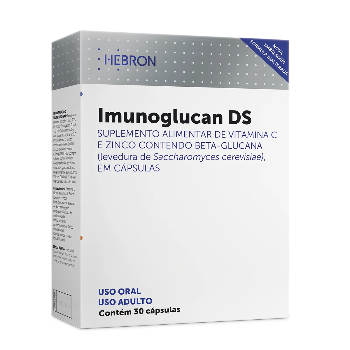 Imunoglucan DS é um suplemento alimentar em cápsulas, indicado para o público adulto e formulado à base de Zinco, vitamina c (com ação antioxidante) e Beta-glucana, um polissacarídeo produzido por várias plantas, bactérias e também por leveduras (tipos de fungos).