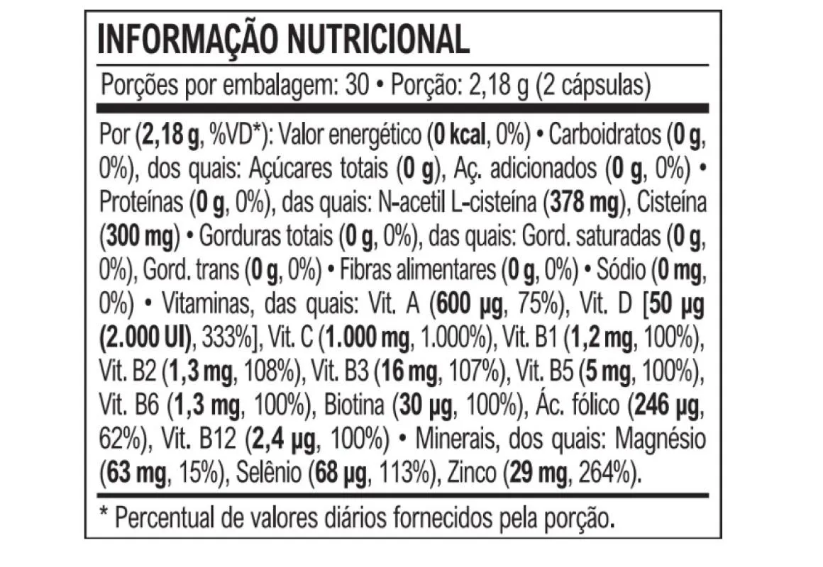 vitamina C), N-acetil L-cisteína, bisglicinato de magnésio (magnésio), bisglicinato de zinco (zinco), levedura enriquecida com selênio (selênio), colecalciferol (