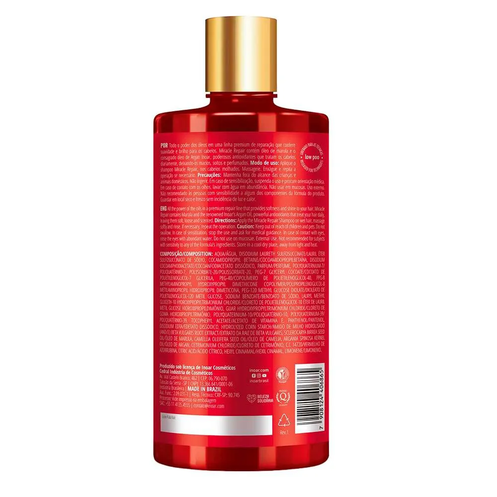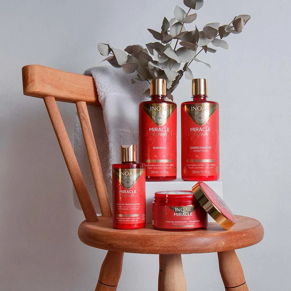 Todo o poder dos óleos em uma linha premium de reparação que confere suavidade e brilho para os cabelos. Miracle Repair contém óleo de marula e o consagrado óleo de Argan Inoar, poderosos antioxidantes que tratam os cabelos diariamente, deixando-os macios, soltos e perfumados.