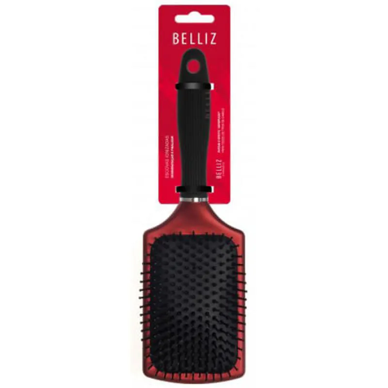 Escova Racket Almofadada de Belliz, com pinos em nylon ionizados com pontas protetoras, cabo emborrachado. Cerdas ionizadas evitam o efeito "arrepiado" dos fios. Penteia e desembaraça todos os tipos de cabelo.