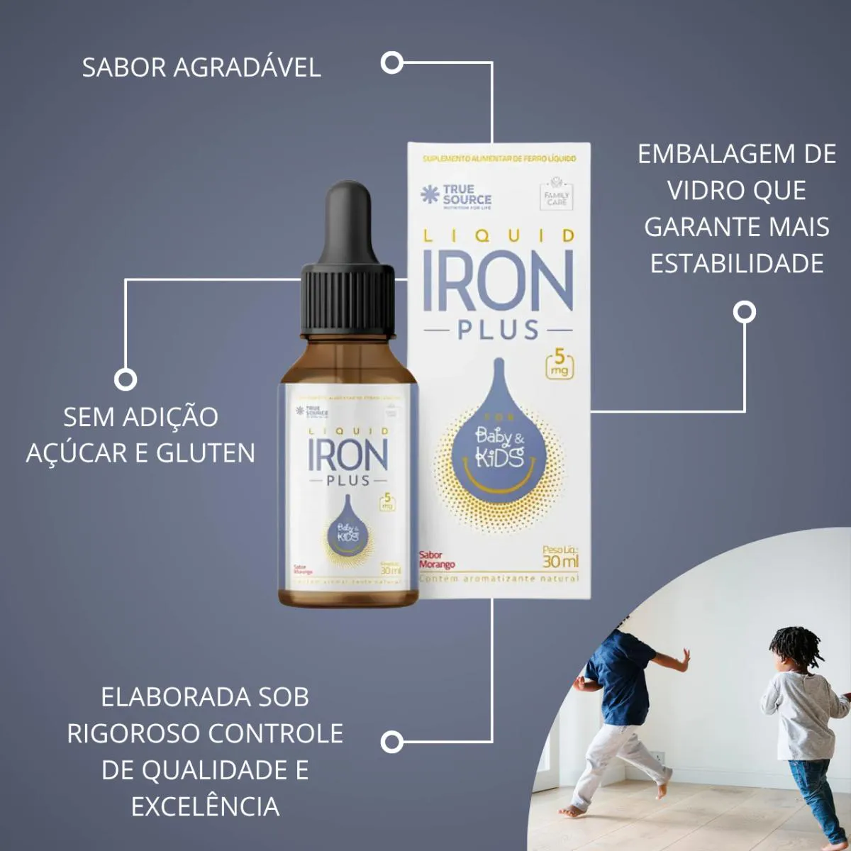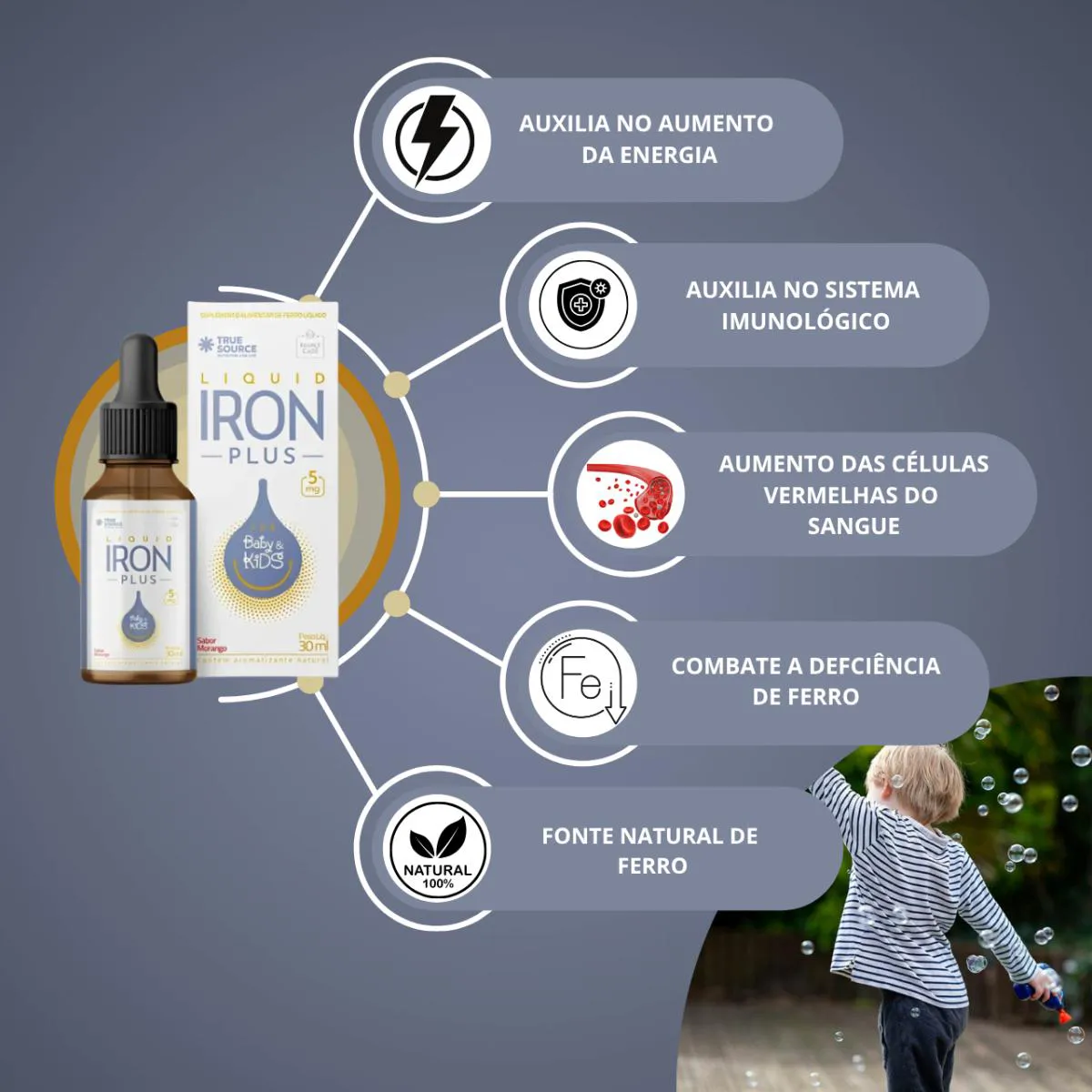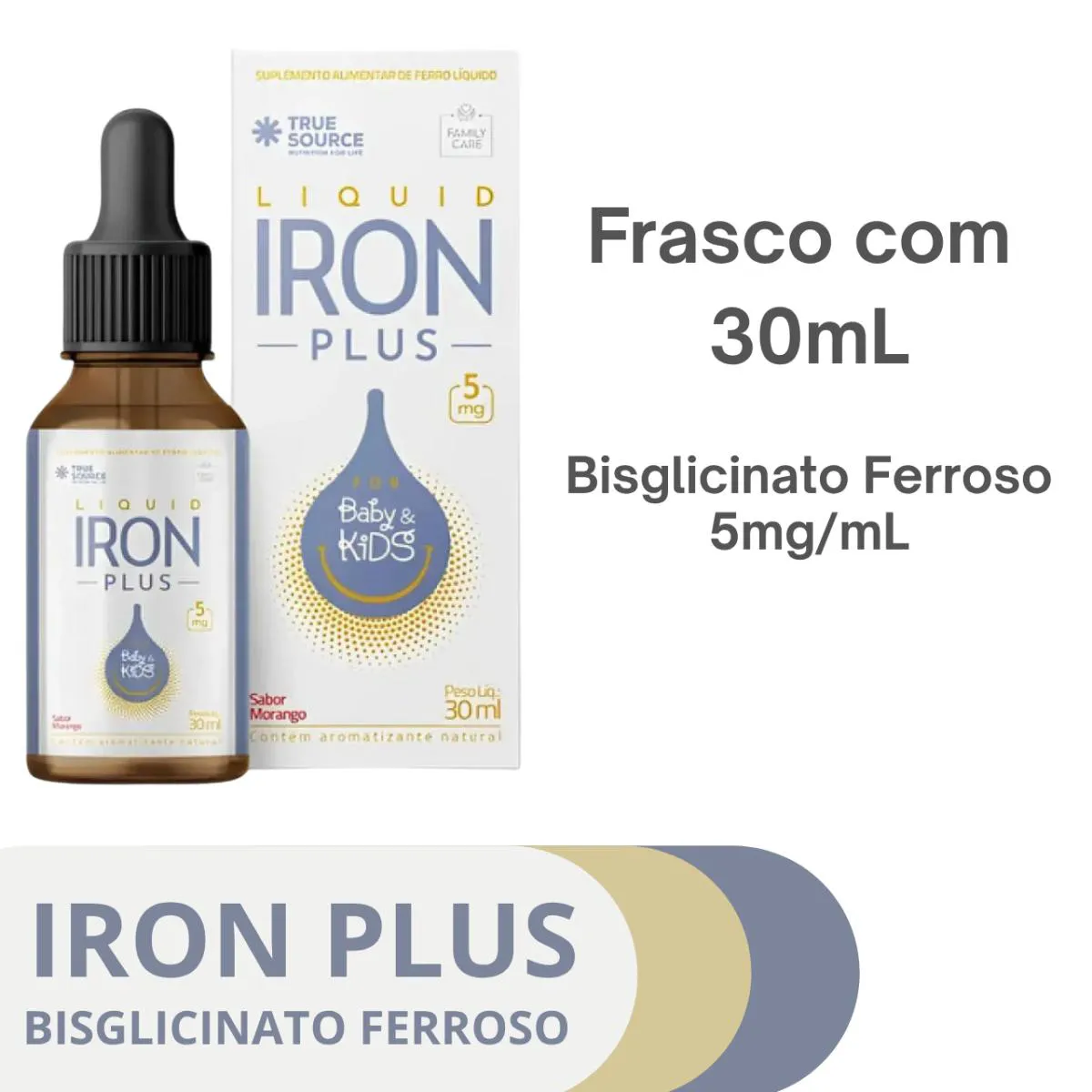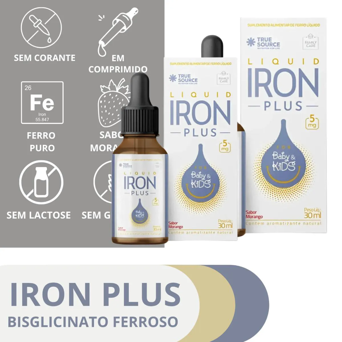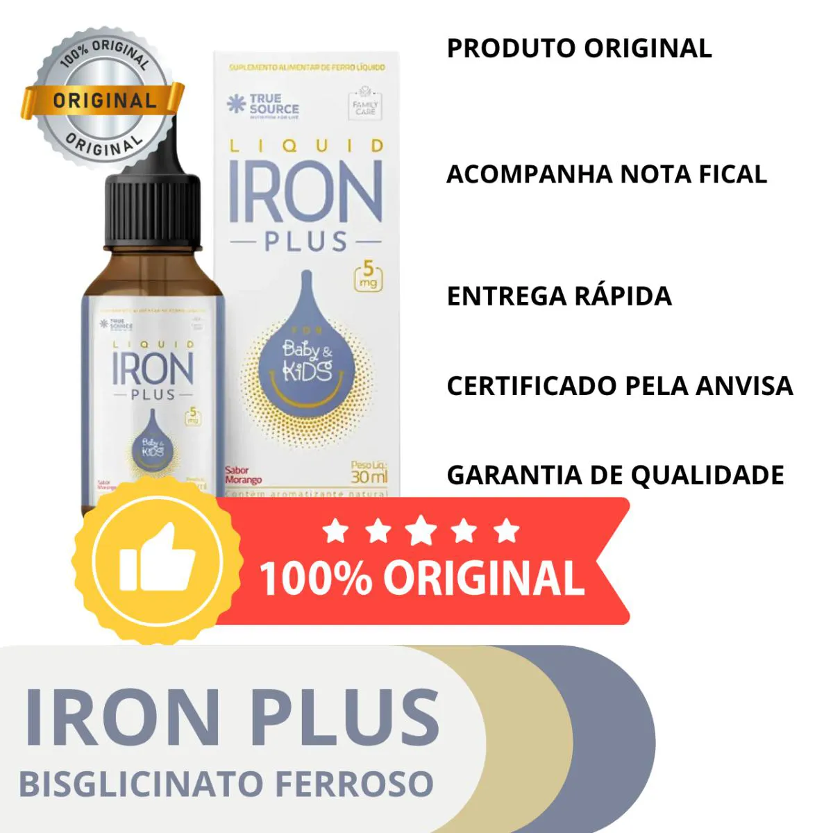 Suplemento IRON PLUS Baby Kids 30ml – True Source – Sabor Morango O IRON PLUS Baby Kids é um suplemento alimentar de ferro desenvolvido especialmente para bebês e crianças em fase de crescimento. Com fórmula líquida de fácil absorção e sabor morango agradável, é ideal para complementar a alimentação infantil e contribuir para o desenvolvimento saudável. Benefícios: Auxilia na prevenção da anemia ferropriva Contribui para o desenvolvimento cognitivo e motor Reforça o sistema imunológico Sabor agradável, aceito pelas crianças Conta-gotas que facilita a dosagem correta Informações do Produto: Marca: True Source Conteúdo: 30ml Forma: Líquido Sabor: Morango Embalagem: Frasco de vidro com conta-gotas Indicado para: Bebês e crianças Produto novo, original, lacrado e com nota fiscal Composição e Segurança: Aprovado pela Anvisa Sem açúcar Sem glúten Sem lactose Conservação: