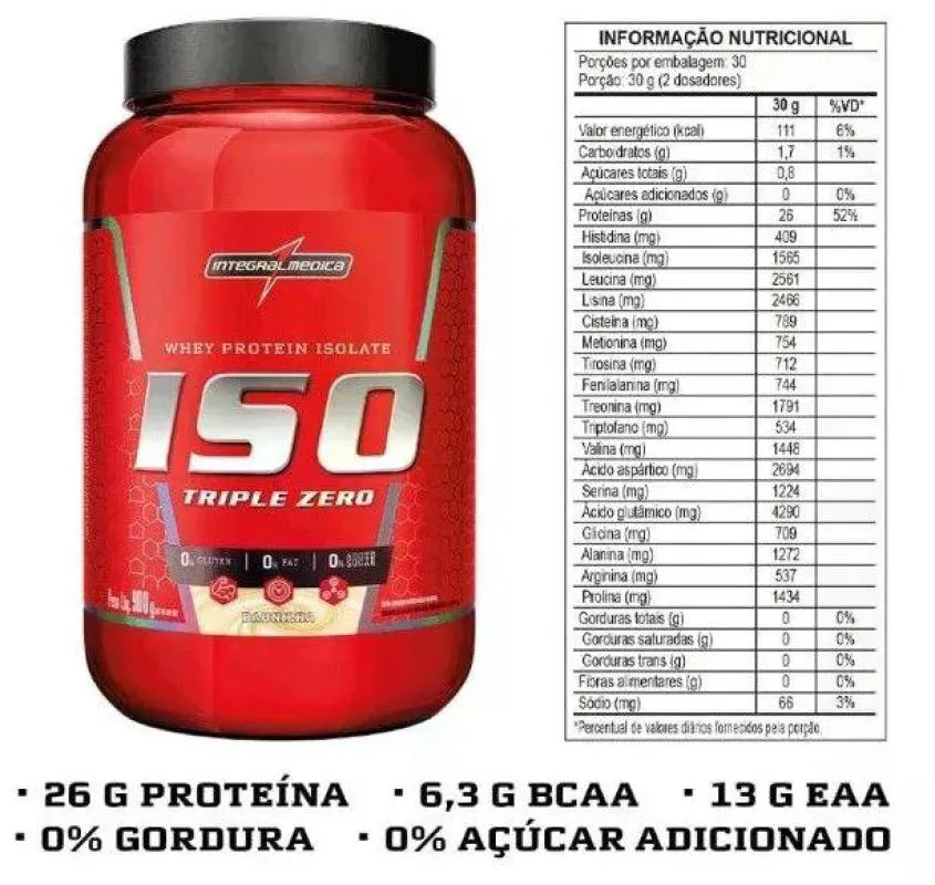 O Iso Triple Zero da Integralmedica, no sabor Baunilha, disponível em embalagem de 907g, é uma excelente escolha para quem busca uma fonte de proteína de alta qualidade, livre de açúcares, gorduras e glúten. Aqui estão alguns pontos importantes sobre este produto: