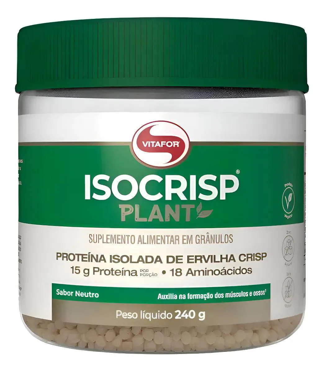 Isocrisp Plant Vegan Vitafor Proteína Isolada 240g – Sabor NeutroO Isocrisp Plant Vegan da Vitafor é uma fonte de proteína vegetal isolada, desenvolvida para quem busca uma nutrição prática, saudável e livre de ingredientes de origem animal. Produzido a partir de proteínas vegetais de alta qualidade, como ervilha e arroz, o produto fornece todos os aminoácidos essenciais necessários para a recuperação e manutenção da massa muscular.Na forma de crisps crocantes, é fácil de adicionar a diferentes preparações — como saladas, iogurtes, frutas, vitaminas, mingaus ou shakes — sem alterar o sabor dos alimentos, graças ao seu sabor neutro.Além de ser vegano, o Isocrisp Plant Vegan é livre de glúten, lactose e açúcares adicionados, sendo uma excelente opção para pessoas com restrições alimentares ou que buscam uma alimentação mais natural.