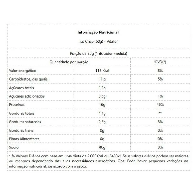 Isocrisp Whey Refil (240g) ISOCRISP WHEY Vitafor é uma forma inovadora de consumir proteína. Através de alta tecnologia, desenvolvemos delicioso “Crisp” proteico à base de whey protein Isolate (proteína isolada do soro de leite) e Whey Protein Concentrate (proteína concentrada do soro do soro de leite), que pode ser consumido juntamente com cereais matinais, saladas de frutas, pudins, sorvetes, gelatinas, caldos e sopas. A proteína que se ajusta a você Consumir proteínas não precisa ser algo chato. A fórmula inovadora de ISOCRISP® possibilita que você complemente a necessidade diária de proteína de forma criativa. Com doces ou salgados, no café da manhã, lanches, almoço e ou jantar, use ISOCRISP® WHEY. Os músculos são essenciais para a preservação de nossa saúde. Eles servem como proteção dos órgãos internos, ossos e possibilitam a mobilidade. Músculos saudáveis são o caminho para uma vida mais ativa e plena. Uma alimentação ineficiente é uma das responsáveis pela perda muscular, na privação de nutrientes, nosso corpo utiliza os músculos como fonte geradora de energia para manter as funções corporais, e com isso ocorre a perda de músculos. Pessoas que passam por cirurgias também podem perder massa magra no pós-operatório. Outro fator natural de perda de massa é o envelhecimento. Na construção e manutenção dos ossos e músculos as proteínas são essenciais. Estudos apontam que a proteína do soro do leite – Whey Protein – é auxiliar para a formação e manutenção de massa muscular tanto em pessoas idosas, quanto em atletas. Benefícios: - Combinação de carboidrato e proteína, que atuam como excelente pré/pós-treino;- Pode ser adicionado junto as refeições promovendo maior aporte proteico (disponibilidade de proteína);- Reforço na suplementação proteica;- Estimula a mastigação; saciedade em preparações;- Contém L-glutamina e bcaa. Diferenciais: Sabor Neutro;Versatilidade em preparações doces e salgadas;Whey Protein Isolate em formato de chips crocantes;Selo de Qualidade VLabor: