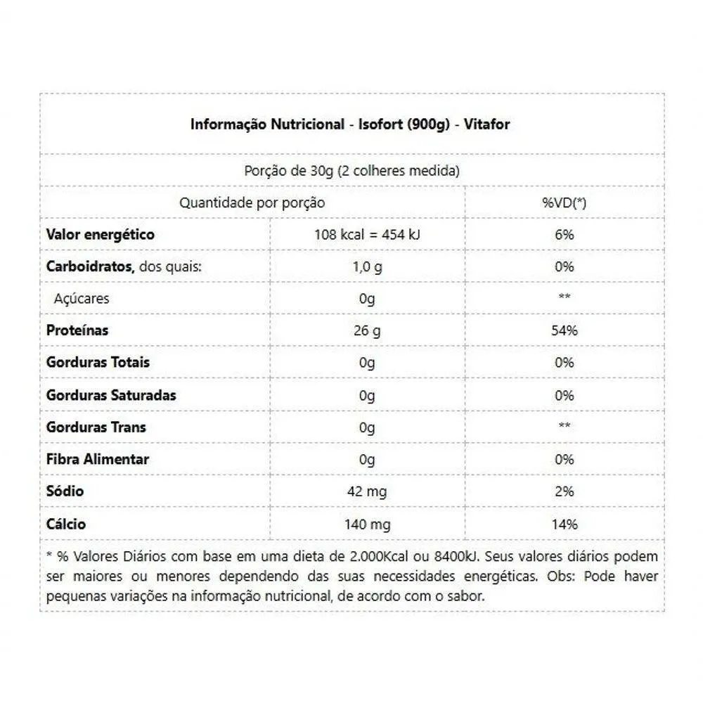 Informação Nutricional Isofort (900g) - Vitafor Sabor: BaunilhaPorção de 30g (2 colheres medida)Quantidade por porção%VD(*)Valor energético108 kcal = 454 kJ6%Carboidratos, dos quais:1,0 g0% Açúcares0g**Proteínas26 g54%Gorduras Totais0g0%Gorduras Saturadas0g0%Gorduras Trans0g**Fibra Alimentar0g0%Sódio42 mg2%Cálcio140 mg14%* % Valores Diários com base em uma dieta de 2.000Kcal ou 8400kJ. Seus valores diários podem ser maiores ou menores dependendo das suas necessidades energéticas. Obs: Pode haver pequenas variações na informação nutricional, de acordo com o sabor. Informação Nutricional Iso Fort (900g) - Vitafor Sabor: Chocolate Porção de 30g (2 colheres medida) Quantidade por porção%VD(*) 4 a 6 anos (**)% VD (*) 7 A 10 anos (**)%VD (*) Adultos (**)Valor energético109 kcal = 458 kJ6%6%6%Carboidratos, dos quais:1,3 g0%0%0% Açúcares0g******Proteínas26 g137%76%52%Gorduras Totais0g0%0%0%Gorduras Saturadas0g0%0%0%Gorduras Trans0g******Fibra Alimentar0g0%0%0%Sódio42 mg2%2%2%Cálcio140 mg23%20%14%* % Valores Diários com base em uma dieta de 2.000Kcal ou 8400kJ. Seus valores diários podem ser maiores ou menores dependendo das suas necessidades energéticas. Obs: Pode haver pequenas variações na informação nutricional, de acordo com o sabor. ** Valores diários de referência para proteínas, vitaminas e minerais baseados em IDR para crianças de 4 a 6 anos, conforme RDC 269/2005. Informação Nutricional Iso Fort (900g) - Vitafor Sabor: KiwiPorção de 30g (2 colheres medida)Quantidade por porção%VD(*)Valor energético112kcal - 471kJ6%Carboidratos, dos quais:1,1 g0% Açúcares0g**Proteínas26 g54%Gorduras Totais0g0%Gorduras Saturadas0g0%Gorduras Trans0g**Fibra Alimentar0g0%Sódio41 mg2%Cálcio137 mg14%* % Valores Diários com base em uma dieta de 2.000Kcal ou 8400kJ. Seus valores diários podem ser maiores ou menores dependendo das suas necessidades energéticas. Obs: Pode haver pequenas variações na informação nutricional, de acordo com o sabor. Informação Nutricional Iso Fort (900g) - Vitafor Sabor: NeutroPorção de 30g (2 colheres medida)Quantidade por porção%VD(*)Valor energético112kcal - 477kJ6%Carboidratos, dos quais:0 g0% Açúcares0g**Proteínas27 g54%Gorduras Totais0g0%Gorduras Saturadas0g0%Gorduras Trans0g**Fibra Alimentar0g0%Sódio42 mg2%Cálcio140 mg14%* % Valores Diários com base em uma dieta de 2.000Kcal ou 8400kJ. Seus valores diários podem ser maiores ou menores dependendo das suas necessidades energéticas. Obs: Pode haver pequenas variações na informação nutricional, de acordo com o sabor. Informação Nutricional Iso Fort (900g) - Vitafor Sabor: Frutas VermelhasPorção de 30g (2 colheres medida)Quantidade por porção%VD(*)Valor energético111kcal - 466kJ6%Carboidratos, dos quais:1,8g52% Açúcares0g**Proteínas26 g52%Gorduras Totais0g0%Gorduras Saturadas0g0%Gorduras Trans0g**Fibra Alimentar0g0%Sódio42 mg2%Cálcio140mg14%* % Valores Diários com base em uma dieta de 2.000Kcal ou 8400kJ. Seus valores diários podem ser maiores ou menores dependendo das suas necessidades energéticas. Obs: Pode haver pequenas variações na informação nutricional, de acordo com o sabor.