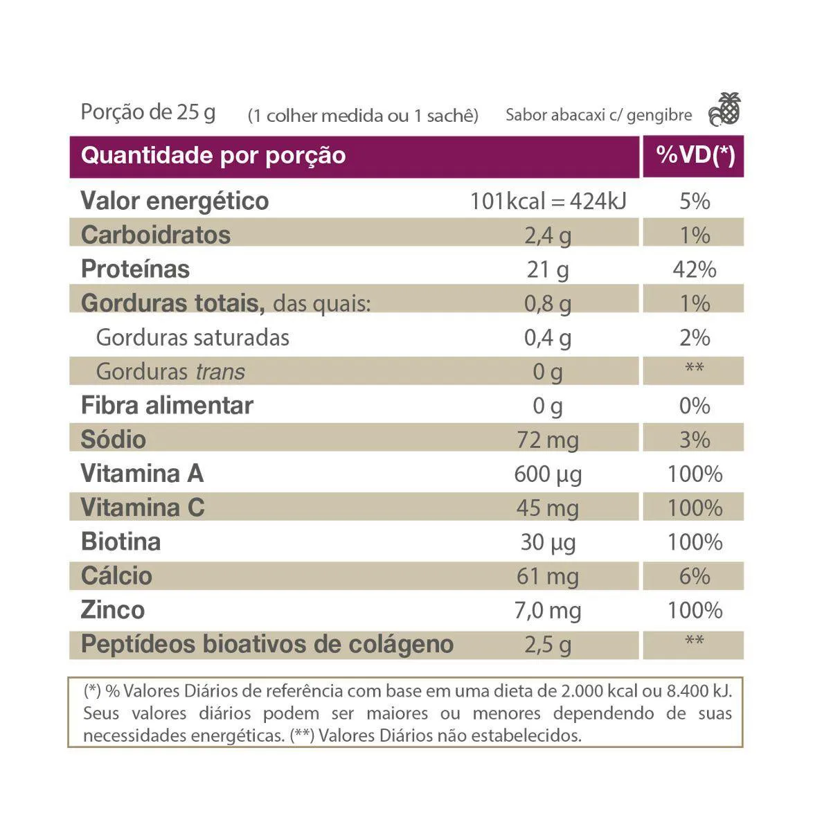 Proteína de soro do leite isolada (Whey Protein Isolate - WPI), proteína de soro do leite hidrolisada (Whey Protein Hidrolyzed - WPH), peptídeos bioativos de colágeno hidrolisado com peso molecular médio de 2kDa (Verisol), polpa de abacaxi, gengibre em pó, ácido ascórbico (vitamina C), bisglicinato de zinco (zinco), acetato de retinol (vitamina A), D-biotina (biotina), aromatizante idêntico ao natural, acidulante ácido cítrico, espessante goma xantana e edulcorantes glicosídeo de esteviol (estévia) e taumatina.