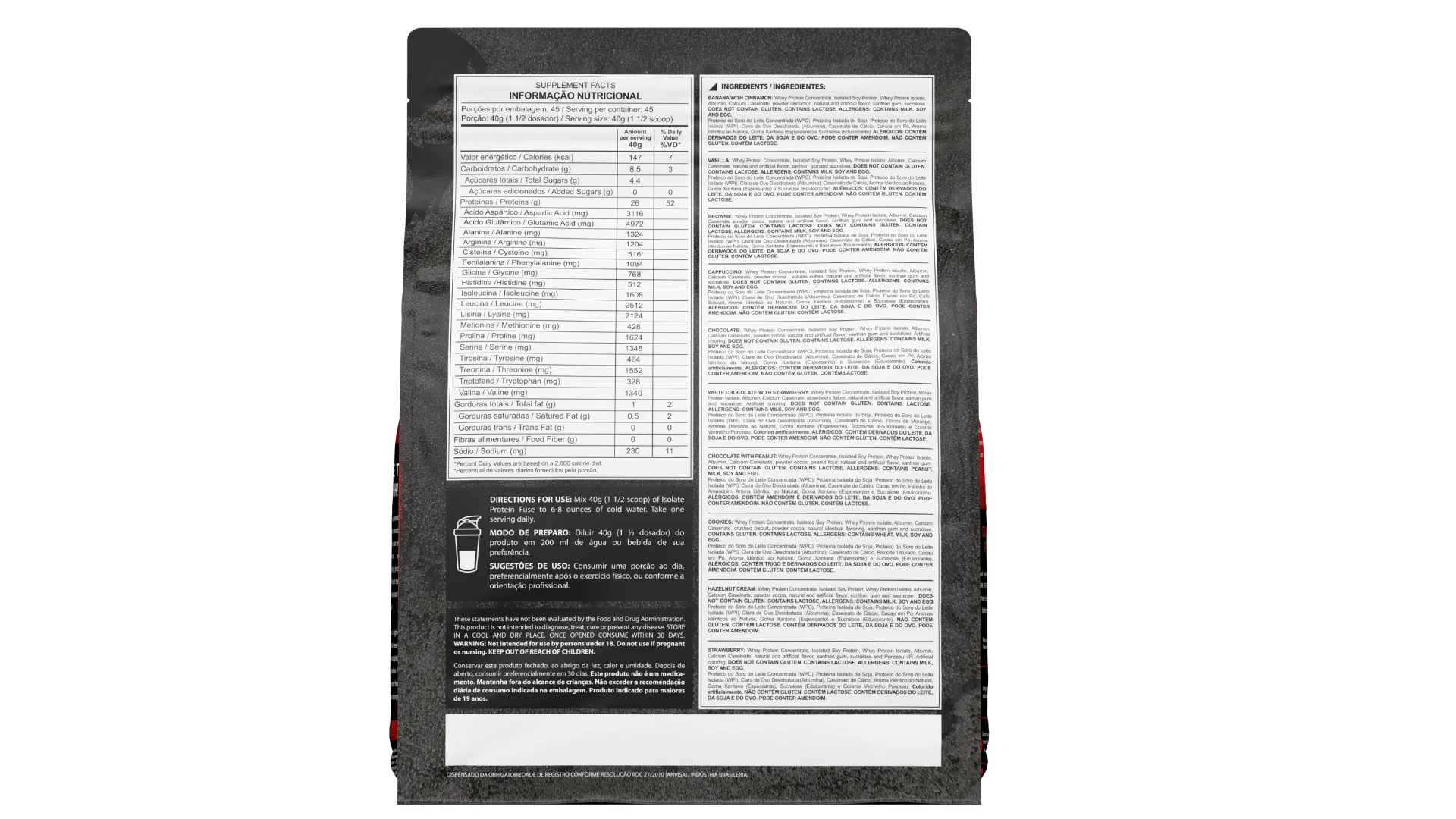 INGREDIENTES: Proteína Concentrada do Soro de Leite (WPC), Proteína Isolada de Soja, Isolado Proteico do Soro do Leite (WPI), Claro do Ovo Desidratada (Albumina) e Caseinato de Cálcio.