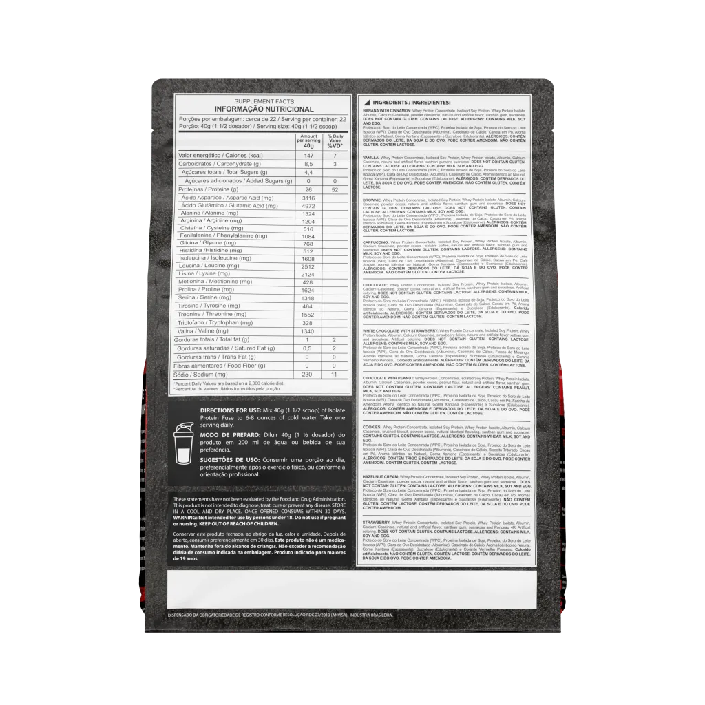Isolate Protein Fuse é rico em BCAAs e outros aminoácidos essenciais que podem proporcionar mais energia e força, garantindo um melhor desempenho, para auxiliar no volume e definição muscular.