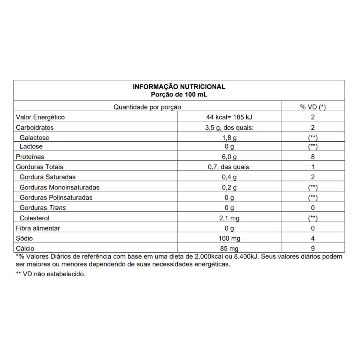 | Valor Energético: 44 kcal = 185 kJ | 2% |