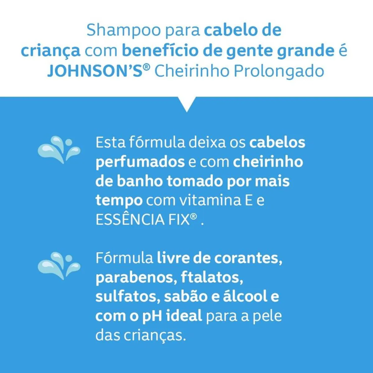 O Shampoo Johnson's Cheirinho Prolongado é um produto desenvolvido especialmente para crianças, com fórmula suave para cabelos delicados. Serve para limpar os cabelos de forma delicada, deixando-os com um cheirinho prolongado, mais saudáveis, mais fortes e macios, proporcionando uma limpeza completa sem irritar os olhos.