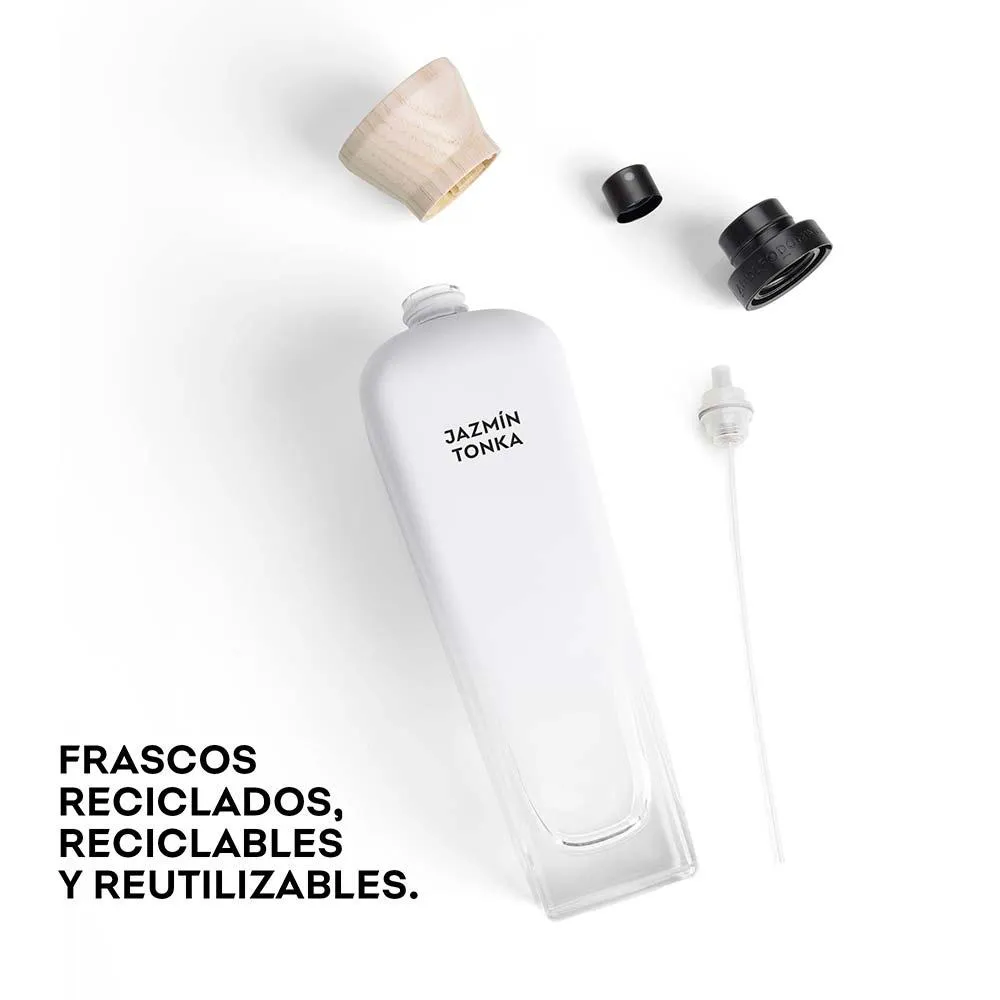 Seu frasco com design único e atemporal reforça o principal pilar da coleção de fragrâncias de Adolfo Dominguez : a sustentabilidade. Combinando o respeito à natureza com a sofisticação, é composto por vidro 36% reciclado, 100% reciclável e reutilizável por toda a vida graças ao borrifador rosqueável.