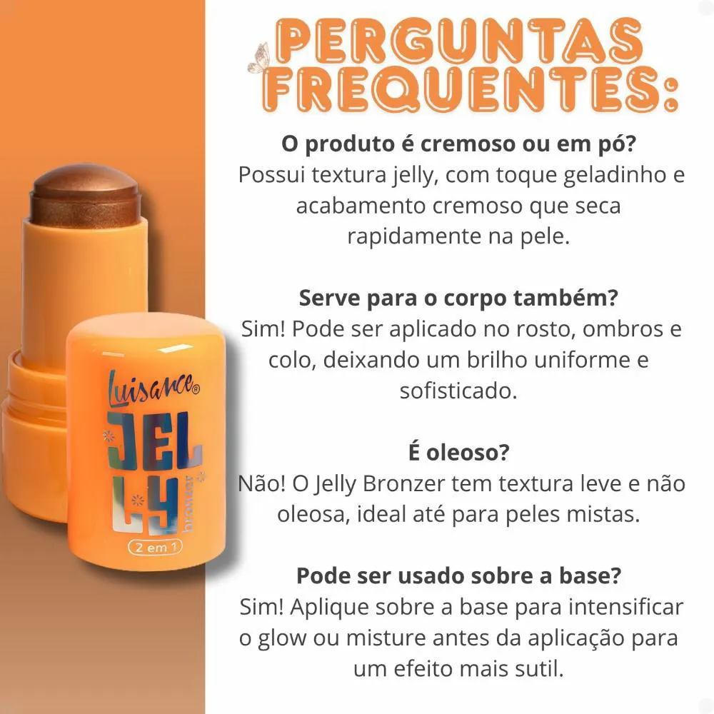 Jelly Bronzer Luisance 2 Em 1 Toffee Glow L3295 é o segredo para um bronze iluminado com frescor! Sua textura jelly geladinha desliza fácil e garante um efeito natural e radiante no rosto e no corpo. Disponível em 3 cores versáteis, é vegano, livre de parabenos e perfeito para realçar sua pele com conforto e luminosidade. Este produto inovador da LUISANCE é a escolha ideal para quem busca um visual bronzeado e iluminado com praticidade e um toque de frescor, proporcionando um acabamento radiante que realça a beleza natural da sua pele. Ideal para quem busca praticidade e um toque de glamour no dia a dia.Benefícios Principais
