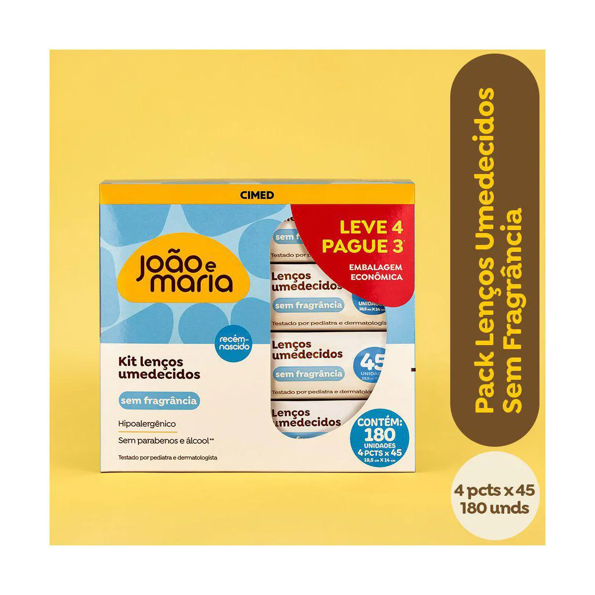 Kit Lenço Umedecido João e Maria Recém-Nascido Sem Fragrância 4 pacotes com 45 unidades cada