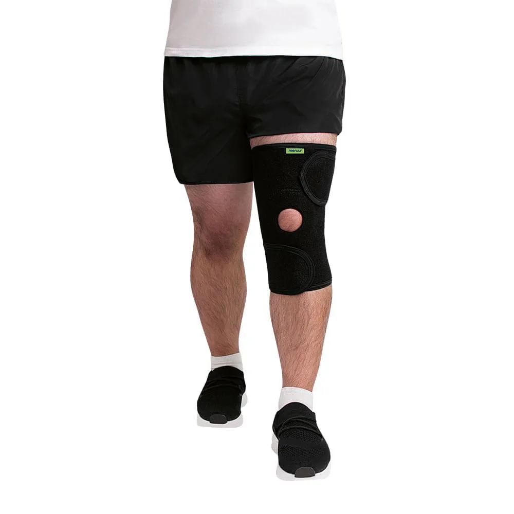 Possui hastes flexíveis oferecendo um grau maior de estabilização do joelho e ajuda a prevenir lesões. Possui orifício reforçado que centraliza a patela e reduz a pressão. Feita em Neoprene microperfurado, mantém a região aquecida e ajuda a reduzir a dor, ao mesmo tempo que facilita a transpiração deixando a pele seca durante o uso.