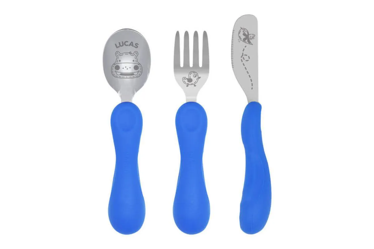 O formato anatômico das peças facilita a pegada e torna a hora das refeições mais agradável. Além disso, a borda arredondada da colher e do garfo evita machucados na boca da criança.