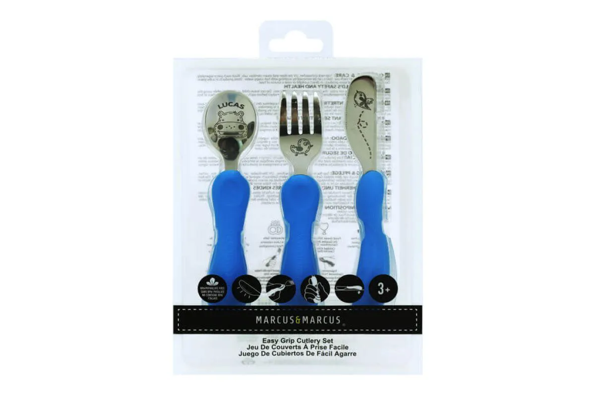 JOGO ANATôMICO COLHER GARFO E FACA COM INOX HIPOPóTAMO LUCAS 3PCS (EM SILICONE E INOX) - MARCUS & MA
