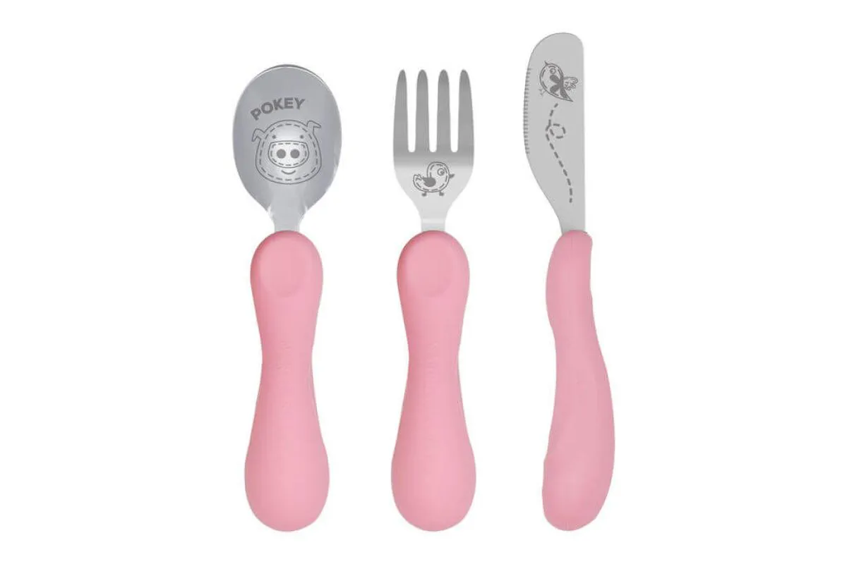 JOGO ANATôMICO COLHER GARFO E FACA COM INOX PORQUINHA POKEY 3PCS (EM SILICONE E INOX) - MARCUS & MAR
