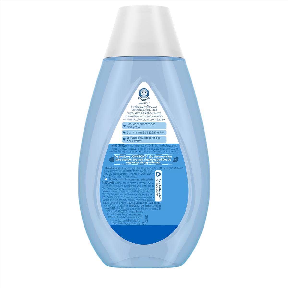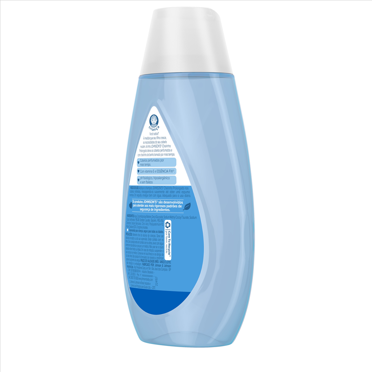 O Shampoo Johnson's Cheirinho Prolongado, possui em sua fórmula Vitamina E, fundamental na proteção dos cabelos, além das tecnologias Essência Fix, que fixa o cheirinho de banho por mais tempo e a exclusiva fórmula Chega de Lágrimas, que não irrita os olhos do bebê. Dermatologicamente testado. Livre de corantes, parabenos, sulfatos e ftalatos.