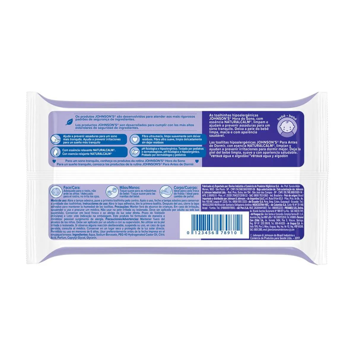Os Lenços Umedecidos Johnson's Baby Hora do Sono são toalhinhas hipoalergênicas feitas com água purificada, enriquecidas com essência NaturalCalm® e tecnologia Chega de Lágrimas, destinadas à limpeza e cuidado do corpo do bebê. Servem para higienizar as mãos, rosto e corpo do bebê, ajudar a prevenir assaduras, acalmar antes do sono e realizar a limpeza após a troca de fraldas, proporcionando uma experiência suave e relaxante sem agredir a pele.