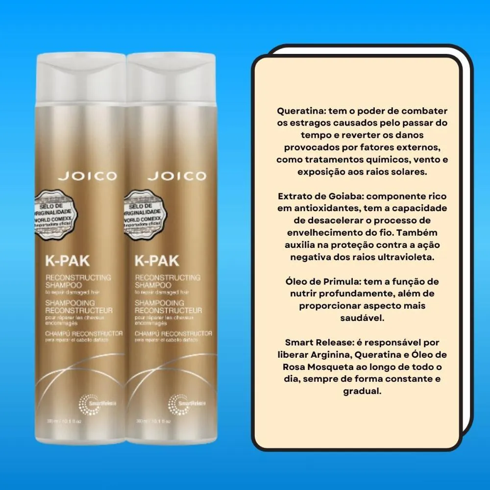 Joico K-PAK shampoo 300ml Shampoo para cabelos danificados, tanto finos quanto grossos. Joico K-Pak Shampoo limpa suavemente, removendo impurezas sem agredir e restaura a fibra capilar. A tecnologia de Joico K-Pak Shampoo restaura, fortalece e protege os fios, deixando-os maleáveis e mais saudáveis. Ação: Complexo Peptídico Bio-Avançado: peptídeo de alta compatibilidade como o cabelo que penetra no interior da fibra capilar e restaura sua saúde desde o interior, deixando os fios muito mais fortes, saudáveis e brilhantes. Complexo Quadramínico: constituído por 19 aminoácidos com o acréscimo de uma carga positiva que concentra os agentes nas áreas mais danificadas, proporcionando uma reconstrução mais eficiente. Keratin Silicone Complex: uma combinação exclusiva de queratina e silicone que devolve a humidade, sela as cutículas e fortalece os fios. vitamina E: possui ação antioxidante, evitando o envelhecimento das células. Aloe: nutre e hidrata os fios, deixando-os mais saudáveis e bonitos. Obs: A textura deste produto pode variar de acordo com temperatura, transporte ou acondicionamento. Ele pode passar a variar seu aspecto do cremoso para o fluído ou "talhado". O fabricante ressalta que este fato não retira ou modifica a qualidade e propriedades de tratamento do produto. Conselho de Aplicação: Aplique o shampoo no cabelo molhado, massageie até formar espuma. Depois, enxágue. Resultado: Cabelo limpo, fortalecido e protegido!