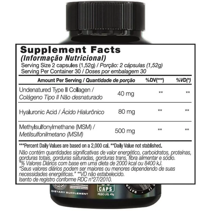 Colágeno de frango tipo II não desnaturado, hialuronato de sódio, Metilsulfonilmetano (MSM), estabilizantes celulose microcristalina. Outros ingredientes: Cápsula gelatina. NÃO CONTÉM LACTOSE. NÃO CONTÉM GLÚTEN.