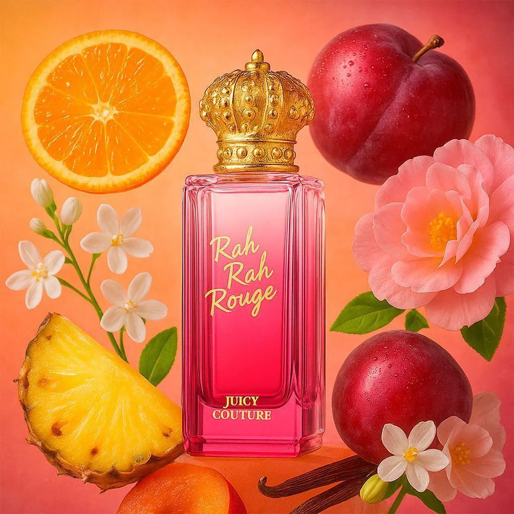 O Juicy Couture Rock The Rainbow Rah Rah Rouge Eau de Toilette 75ml é uma fragrância floral frutada, lançada em 2017, que celebra a energia vibrante e a feminilidade divertida. Desenvolvida para mulheres jovens ou jovens de espírito, combina a abertura suculenta de tangerina, ameixa vermelha e abacaxi com um coração floral delicado de muguet, jasmim sambac e peônia, finalizando com uma base cremosa de almíscar, baunilha e sândalo. Ideal para uso diário ou ocasiões descontraídas, reflete o estilo alegre e descolado da marca. O frasco, com design ombré rosa e tampa em forma de coroa, traduz a essência divertida e glamourosa da Juicy Couture.