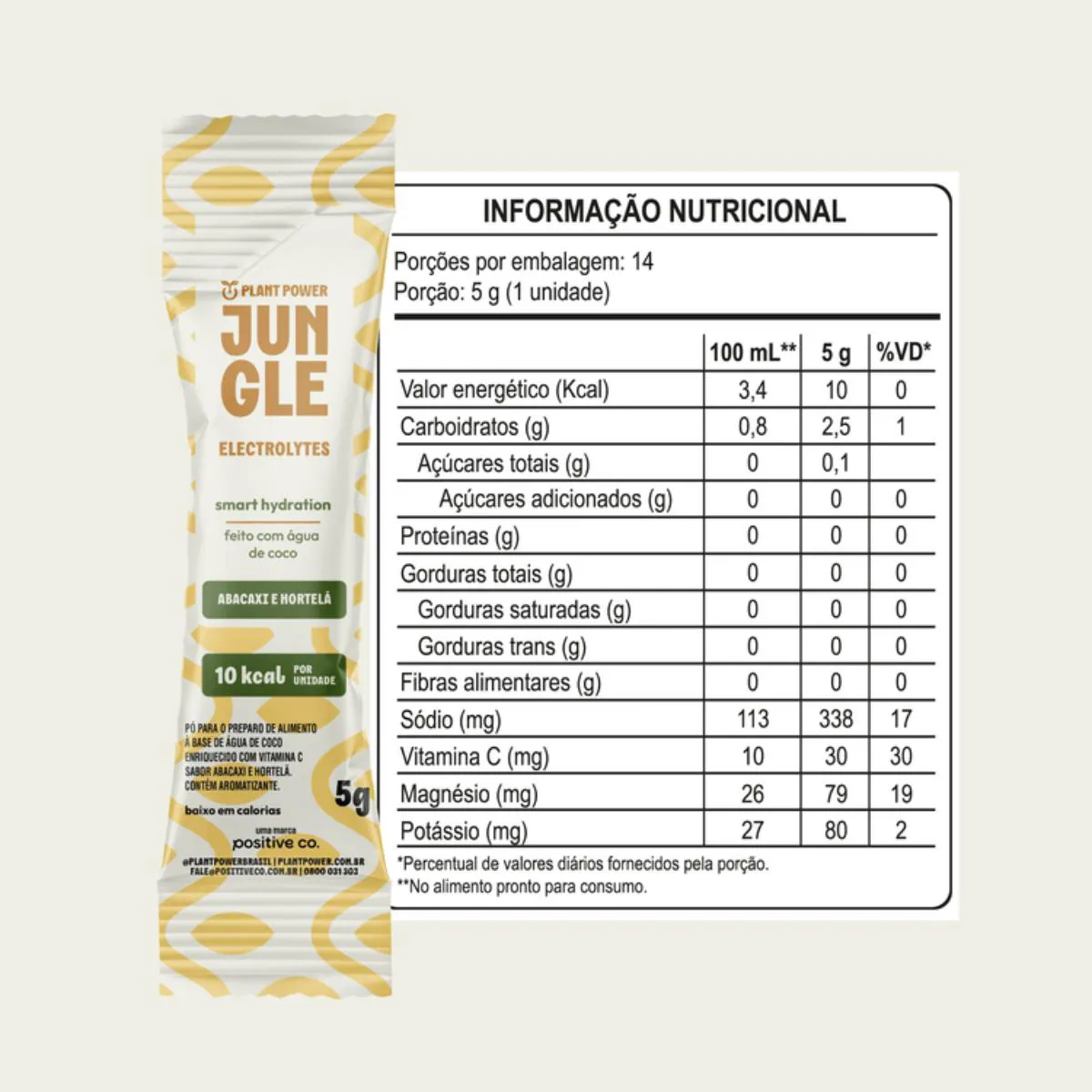 O Jungle Electrolytes Abacaxi e Hortelã é um suplemento de eletrólitos em pó, desenvolvido para quem busca uma hidratação prática, leve e eficiente. Com um sabor refrescante e equilibrado de Abacaxi e Hortelã, essa bebida funcional entrega os principais minerais que o corpo precisa para manter o ritmo e o bem-estar. Cada porção de 5g (diluída em 300ml de água) possui apenas 10 calorias. A fórmula é vegana e limpa — sem açúcar, sem conservantes, sem corantes e livre de aditivos sintéticos. Uma solução inteligente para repor eletrólitos, fortalecer a imunidade, auxiliar na recuperação muscular e trazer mais equilíbrio à sua rotina. Ingredientes: Abacaxi em pó, sais de magnésio do ácido cítrico (magnésio), água de coco orgânica em pó, ácido ascórbico (vitamina c), cloreto de sódio (sal), hortelã em pó, regulador de acidez citrato de sódio e ácido cítrico, aromas naturais, estabilizante citrato de potássio, antiumectante fosfato tricálcico e edulcorante glicosídeos de steviol produzido enzima camente. NÃO CONTÉM GLÚTEN. Basta diluir uma porção em 300 mL de água para uma bebida refrescante, funcional e pronta para acompanhar sua rotina — no treino, no trabalho ou onde você estiver.