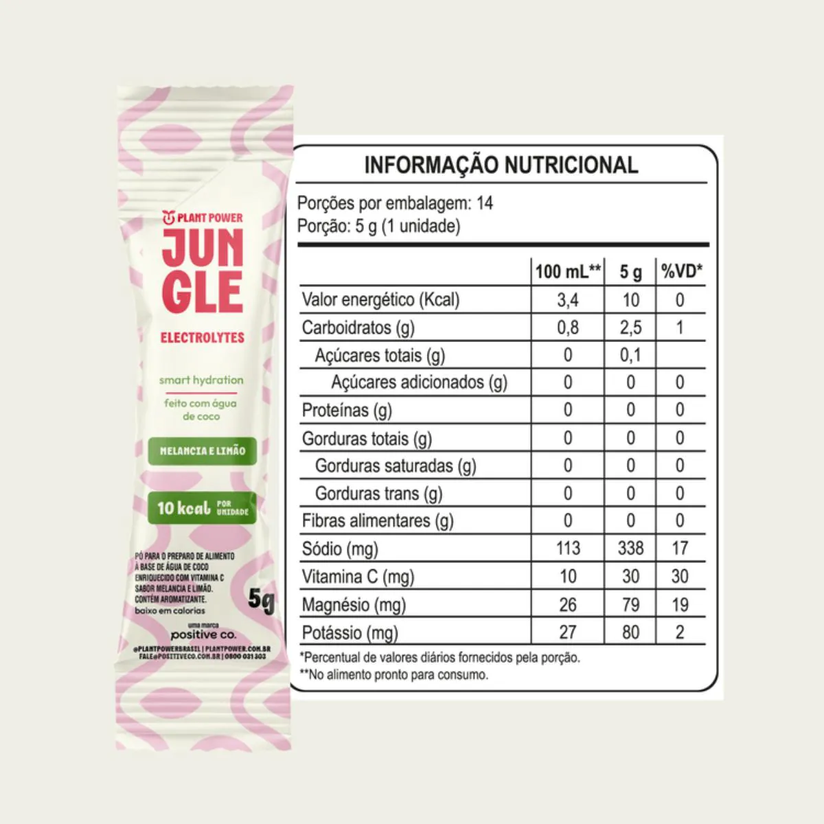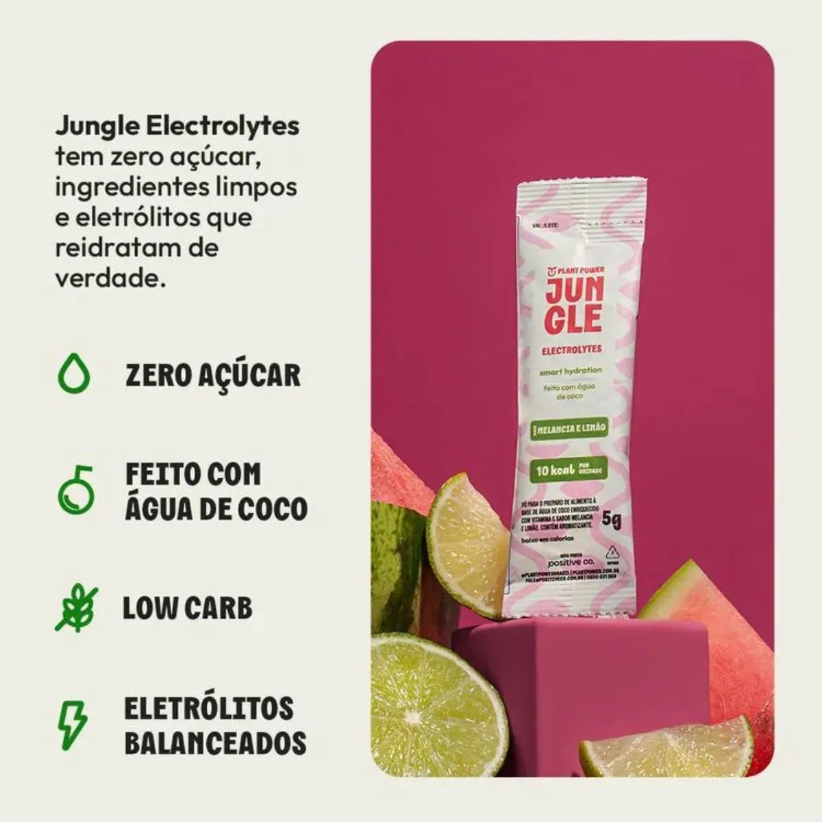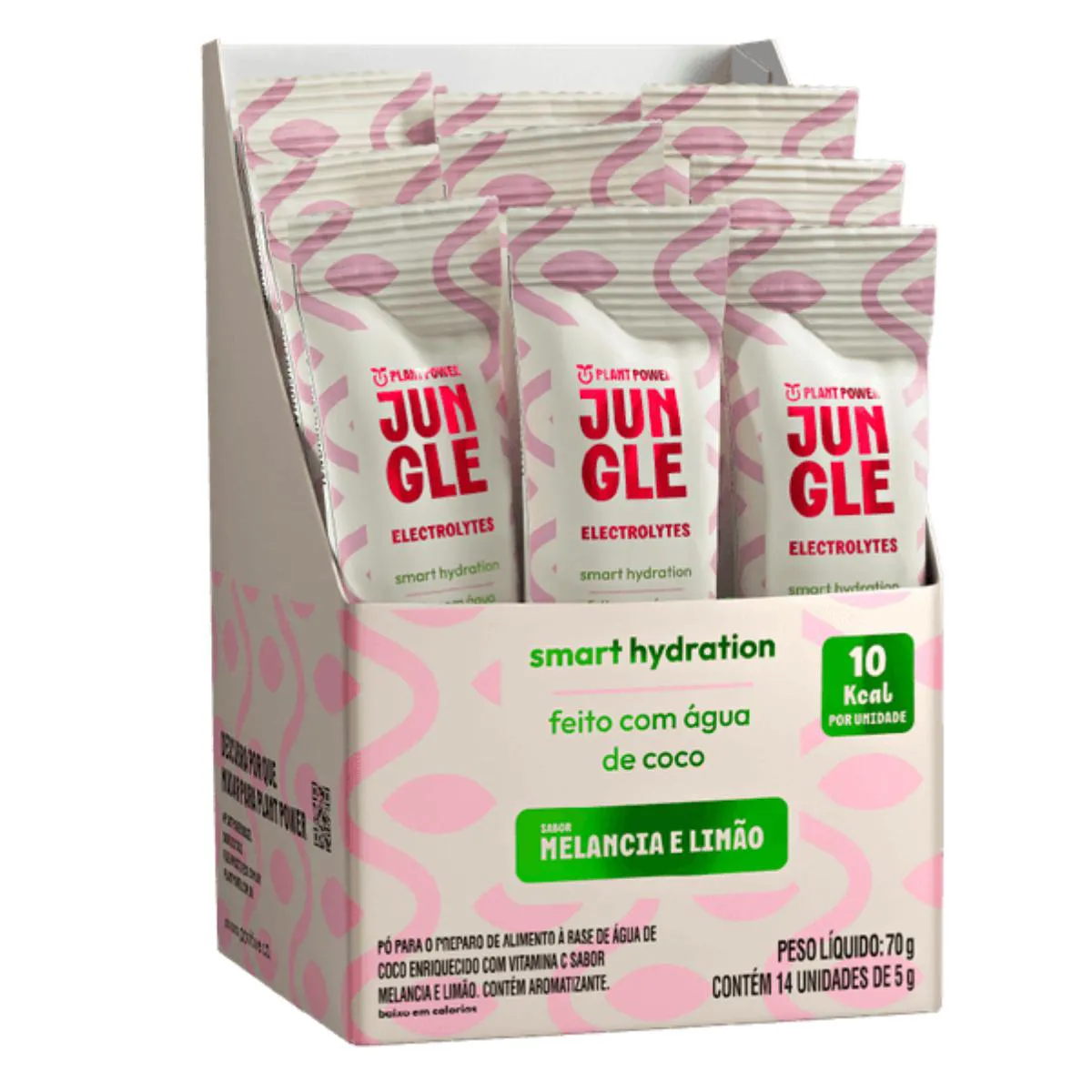 O Jungle Electrolytes Melancia com Limão é um suplemento de eletrólitos em pó, desenvolvido para quem busca uma hidratação prática, leve e eficiente. Com um sabor refrescante e equilibrado de melancia com limão, essa bebida funcional entrega os principais minerais que o corpo precisa para manter o ritmo e o bem-estar. Cada porção de 5g (diluída em 300ml de água) possui apenas 10 calorias. A fórmula é vegana e limpa — sem açúcar, sem conservantes, sem corantes e livre de aditivos sintéticos. Uma solução inteligente para repor eletrólitos, fortalecer a imunidade, auxiliar na recuperação muscular e trazer mais equilíbrio à sua rotina. Ingredientes: Sais de magnésio do ácido cítrico (magnésio), água de coco orgânica em pó, melancia em pó, ácido ascórbico (vitamina c), limão em pó, cloreto de sódio (sal), regulador de acidez citrato de sódio e ácido cítrico, aromas naturais, estabilizante citrato de potássio, antiumectante fosfato tricálcico e edulcorante glicosídeos de steviol produzido enzimaticamente. Basta diluir uma porção em 300 mL de água para uma bebida refrescante, funcional e pronta para acompanhar sua rotina — no treino, no trabalho ou onde você estiver.
