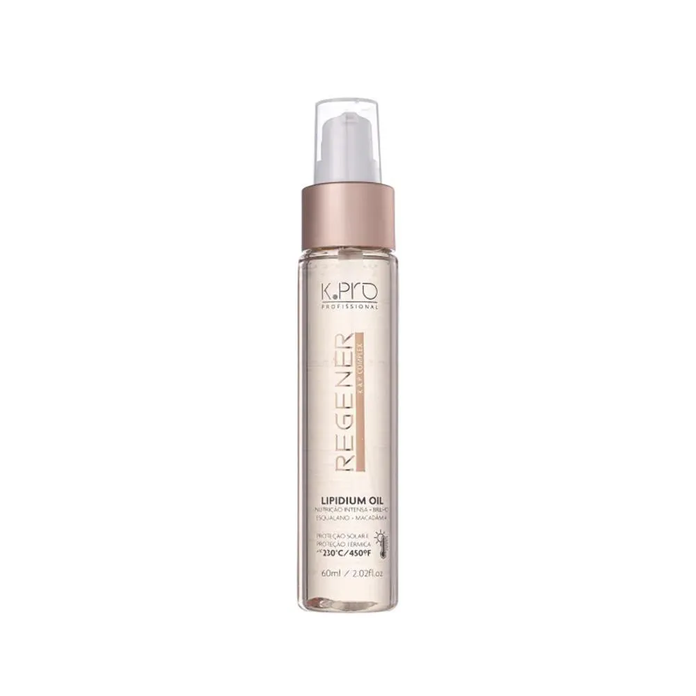 Óleo capilar para cabelos fragilizados e ressecados. K.Pro Regenér Lipidium Oil nutre, dá brilho e oferece proteção completa, tanto solar quanto térmica (até 230°C). O Óleo Capilar K.Pro Regenér Lipidium Oil foi desenvolvido especialmente para deixar os seus fios lindamente luminosos, livres do frizz e perfeitamente protegidos contra o calor emitido pelos raios solares ou por ferramentas térmicas, como chapinha, secador e babyliss. Com formulação exclusiva, que conta com silicones leves, Esqualano e Macadâmia entre os principais ingredientes da composição, o produto é multifuncional e, assim, é opção perfeita para quem busca conquistar cabelos muito mais hidratados, macios e soltinhos. Livre de parabenos e de óleos minerais.