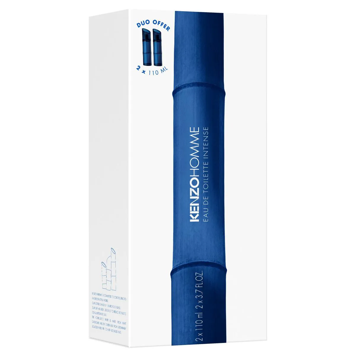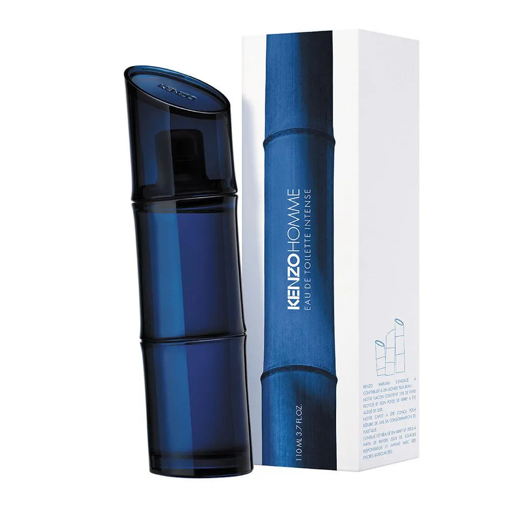 A embalagem e o frasco do novo Kenzo Homme Eau de Toilette Intense trazem o conceito da sustentabilidade de Kenzo, que atua sempre por um mundo mais belo. O frasco agora é feito com 10% de vidro reciclado e reduz a quantidade de vidro em 23%, junto de um novo conceito de tampa que reduz em 34% o consumo de plástico. Já a caixa da fragrância é feita com papel de origem sustentável e papelão reciclado, também apresentando o selo de coleta seletiva.