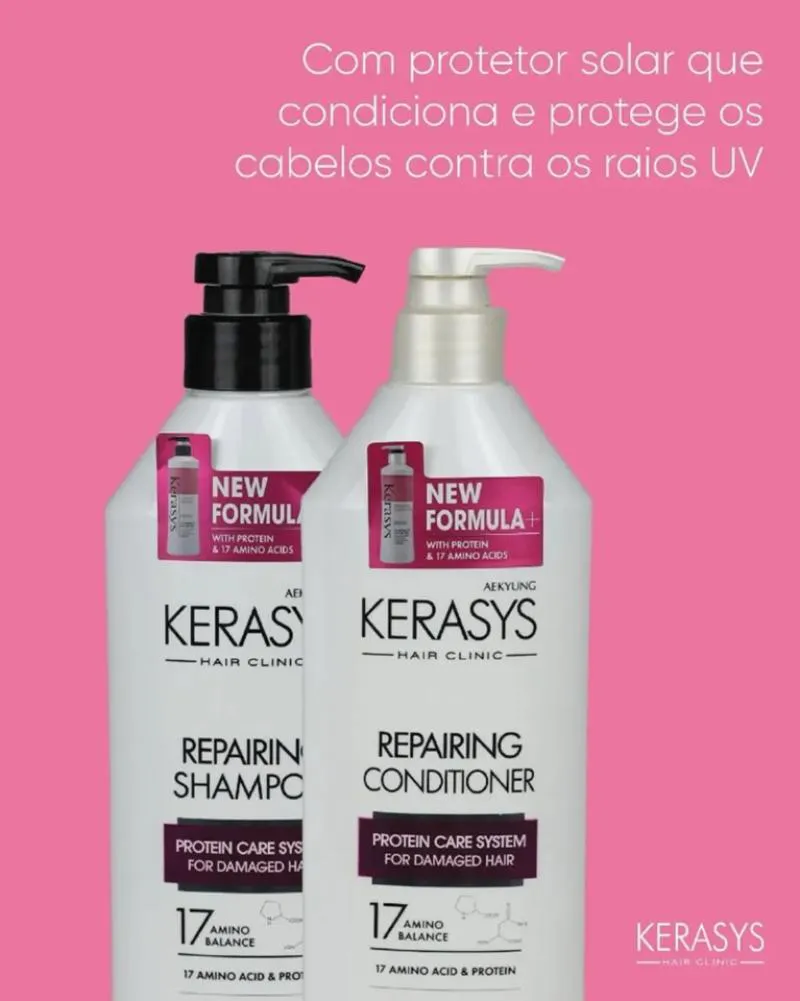 KERASYS REPAIRING KIT (SH600+COND600) Kerasys Repairing shampoo - Argan Oil é um tratamento de reparação intensiva, criado para restaurar fios danificados com a mais avançada tecnologia capilar da Coreia do Sul. Sua fórmula combina o exclusivo Protein Care System, que age diretamente na estrutura dos fios para reparar e fortalecer, com o precioso Óleo de Argan, conhecido por suas propriedades nutritivas e antioxidantes. Potencializado por um complexo de 17 aminoácidos e proteínas hidrolisadas, este shampoo devolve força, resistência e brilho absoluto aos cabelos, transformando cada fio da raiz às pontas. Kerasys Repairing Conditioner - Argan Oil é um condicionador de reparação intensa, desenvolvido para cabelos danificados que precisam de nutrição profunda, fortalecimento e um toque sedoso duradouro. Inspirado na ciência capilar da Coreia do Sul, sua fórmula rica em ativos reparadores age diretamente na fibra capilar, recuperando a elasticidade e devolvendo o brilho absoluto aos fios. Modo de Uso Aplique o Shampoo sobre os cabelos molhados, massageando delicadamente o couro cabeludo para ativar os ingredientes reparadores. Deixe agir por alguns instantes, permitindo que as proteínas e aminoácidos penetrem profundamente na fibra capilar. Enxágue completamente e sinta a textura sedosa e revitalizada dos fios. Aplique uma quantidade generosa do Condicionador no comprimento e pontas. Massageie suavemente e deixe agir por alguns minutos. Enxágue abundantemente para revelar fios macios, brilhantes e reparados.