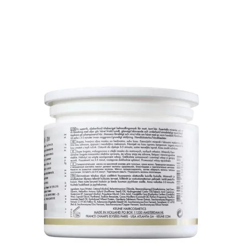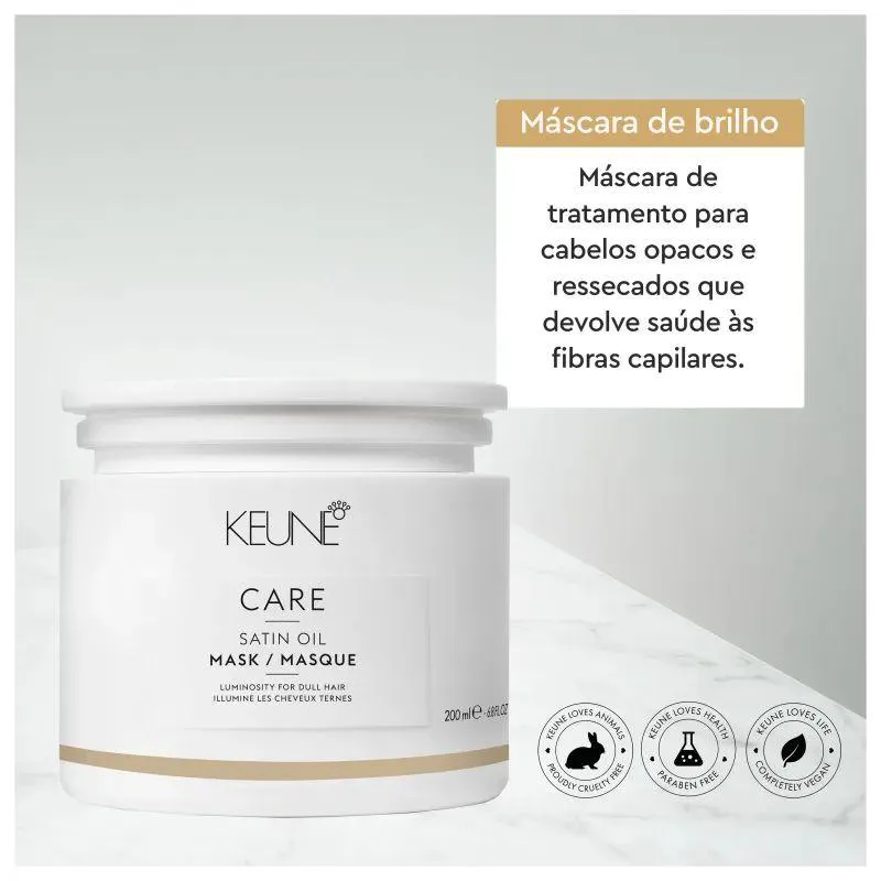 máscara de tratamento para fios secos e opacos. Keune Care Satin Oil Mask hidrata profundamente para fios com brilho e maciez. A Máscara Keune Care Satin Oil Mask possui fórmula rica em óleos e com um complexo de minerais que atua nas diversas camadas do fio. É facilmente absorvida e age de dentro para fora, sem pesar, para um resultado de brilho intenso e natural.