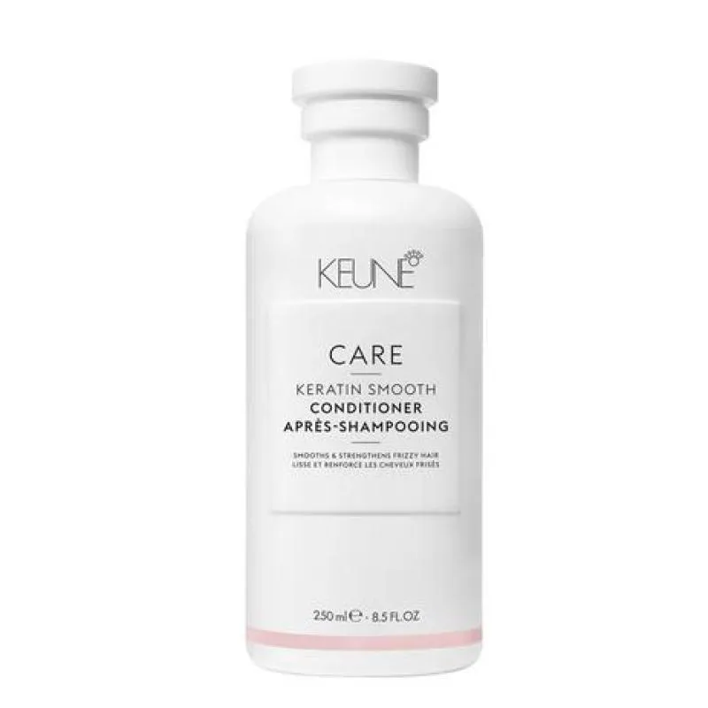 Keune Care Keratin Smooth Conditioner devolve a queratina perdida em processos químicos, como alisamentos definitivos ou mechas, reestruturando a fibra capilar, devolvendo força e brilho aos fios. Também protege o cabelo do calor e agressões com a formação de um filme protetor.