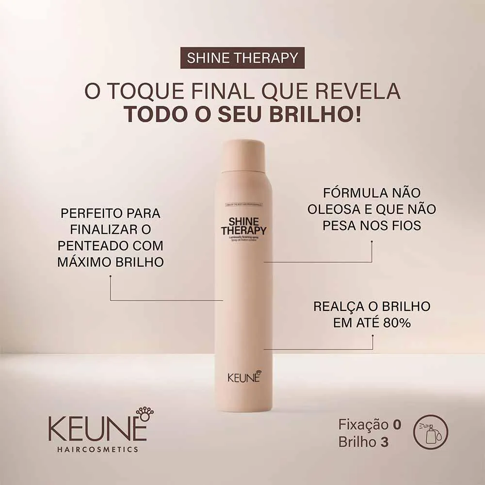 O Keune Style Shine Therapy Spray De Fixação é um spray finalizador inovador e vegan desenvolvido para cabelos, com uma fórmula leve e não oleosa. Serve para realçar o brilho dos fios em até 80%, controlar frizz e estática, proporcionar um acabamento profissional e deixar o cabelo com aspecto saudável e radiante. Pode ser usado em todos os comprimentos e tipos de cabelo, oferecendo um efeito de salão em casa com aplicação rápida e eficiente.