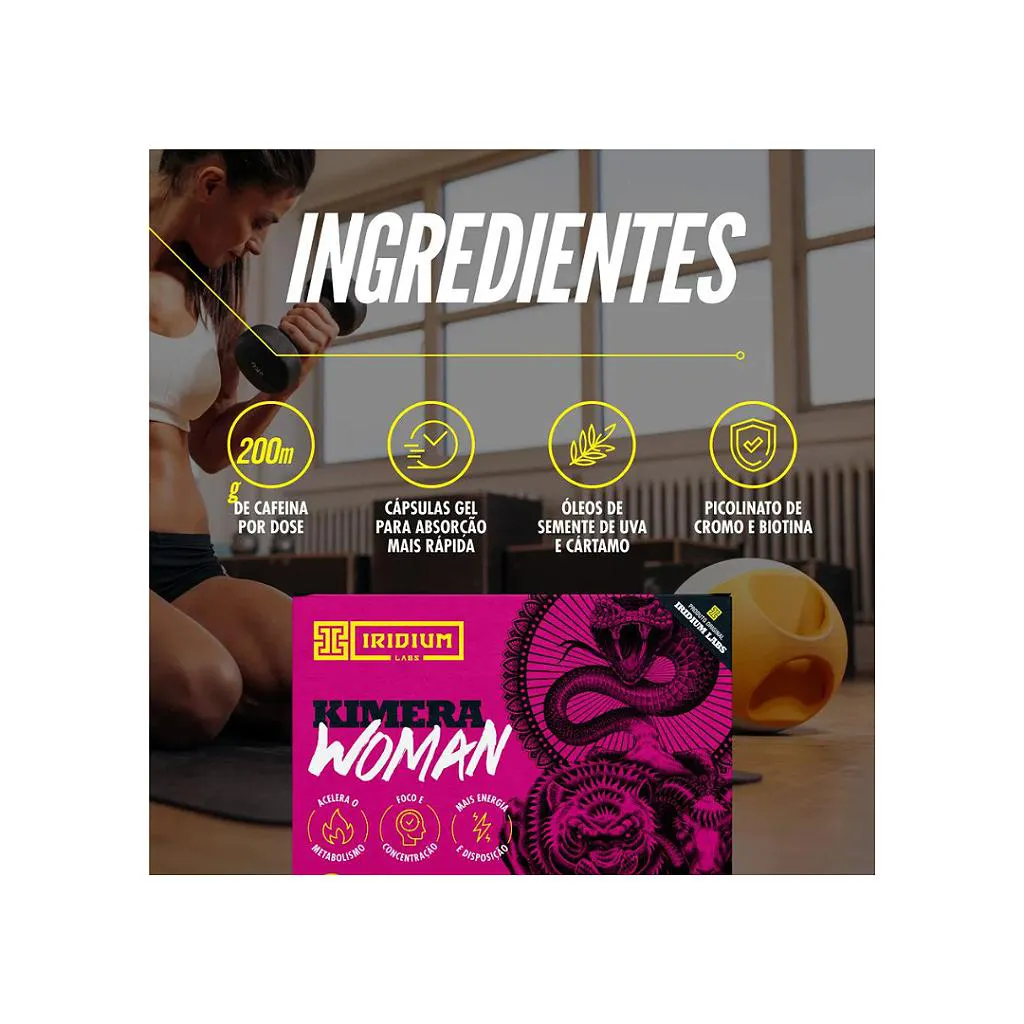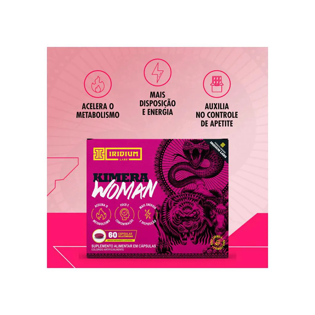 - O Kimera Woman foi desenvolvido especialmente para o corpo feminino, combinando a potência do termogênico mais famoso do Brasil com nutrientes que apoiam o equilíbrio e a saúde da mulher. Sua fórmula exclusiva acelera o metabolismo, aumenta a disposição, auxilia no controle de peso e melhora a performance durante os treinos.