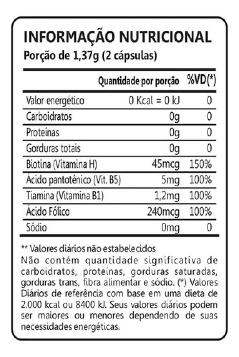 Biotina (vitamina H), ácido pantotênico (vitamina B5), tiamina (vitamina B1), ácido fólico excipiente: silicato de magnésio, antiumectante: dióxido de silício, cápsula: gelatina. NÃO CONTÉM GLÚTEN.